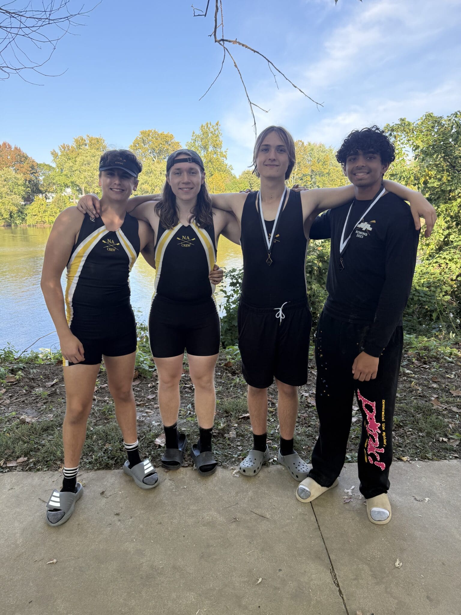 Four rowers in matching gear pose by a riverside with medals, surrounded by trees and a clear blue sky.