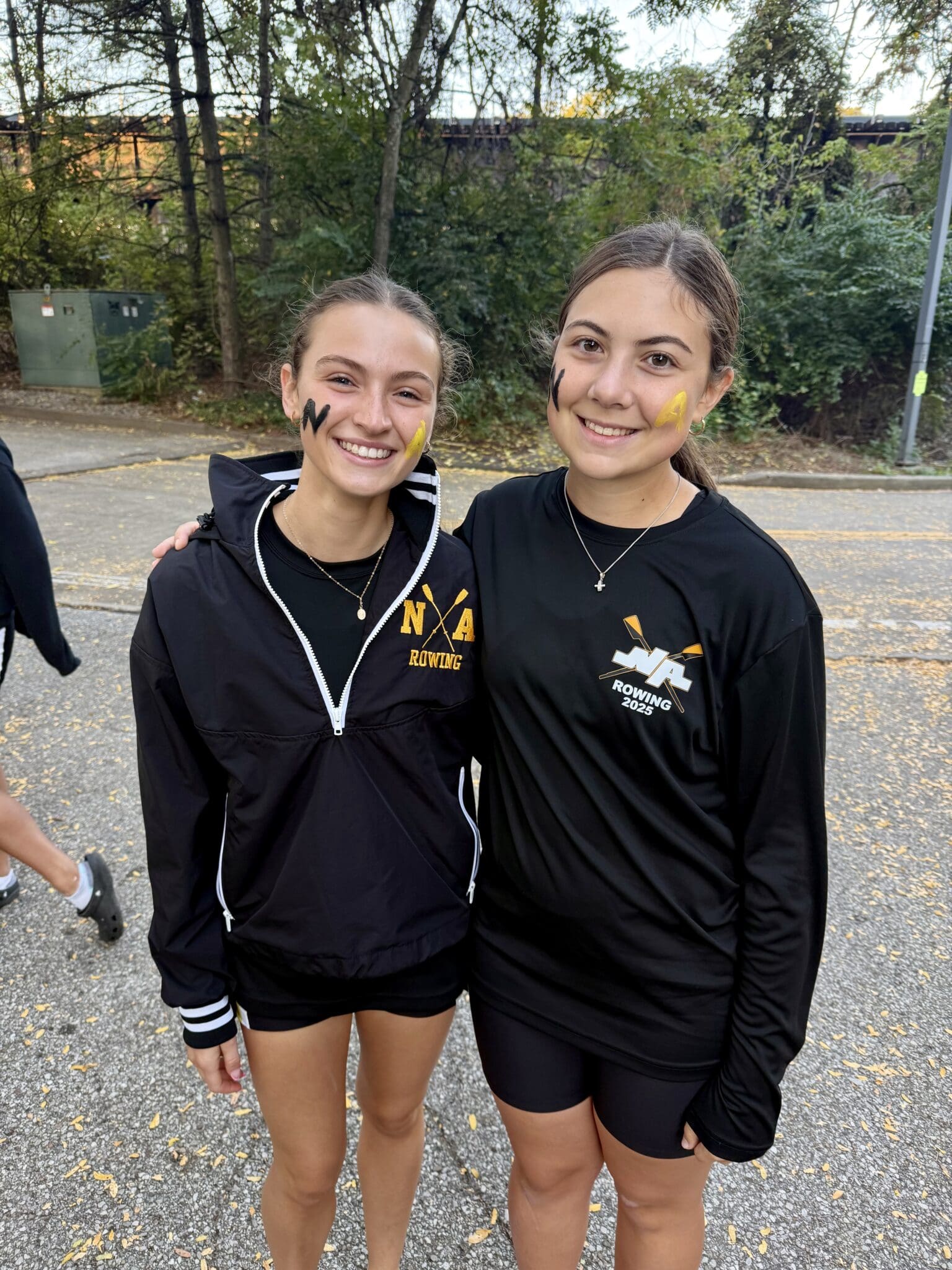 Two smiling women in rowing team gear with face paint, outdoors with trees in the background.