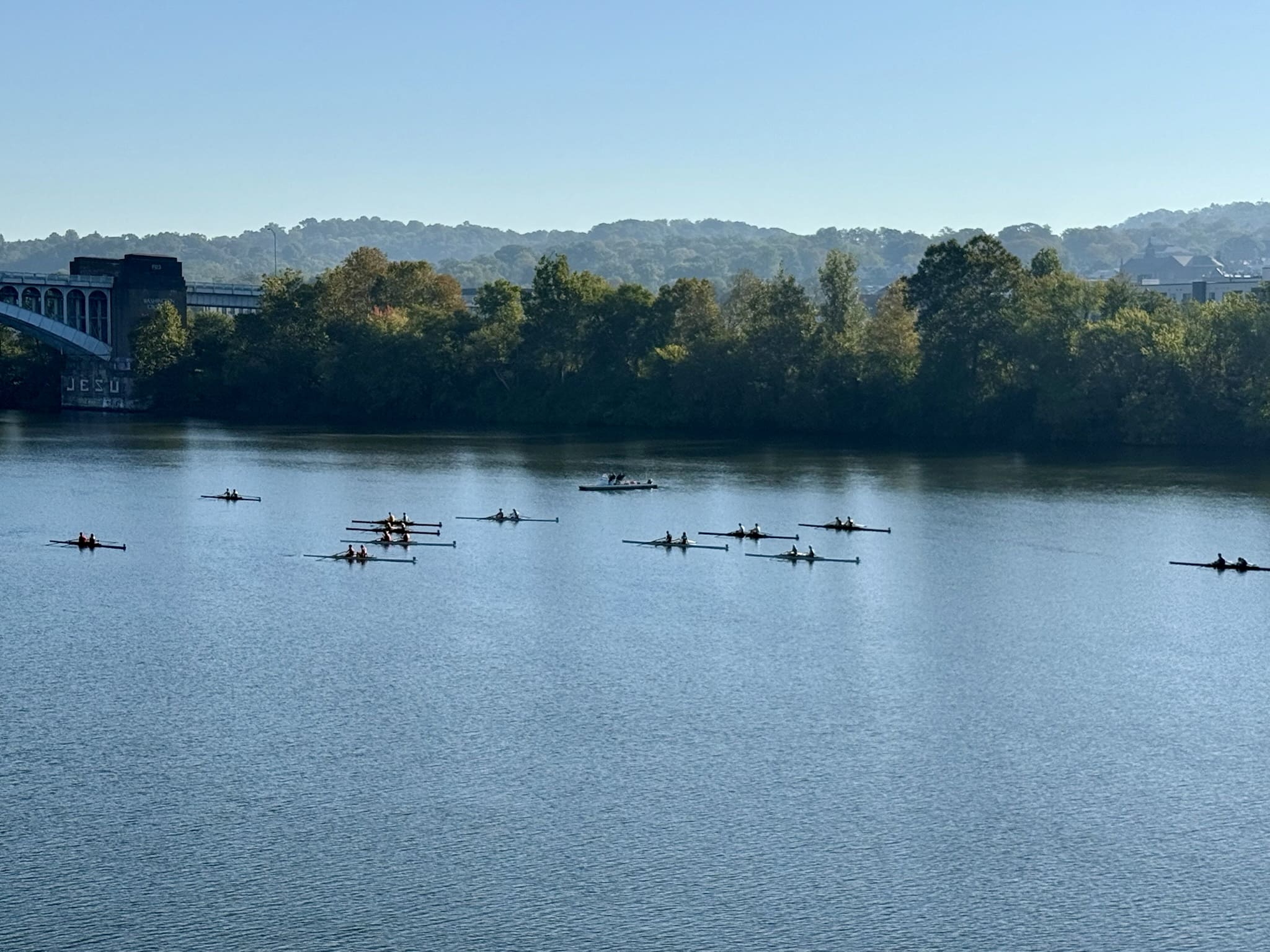 Rowers on a calm river under a blue sky with a bridge and tree-lined bank in the background, enjoying a serene day.