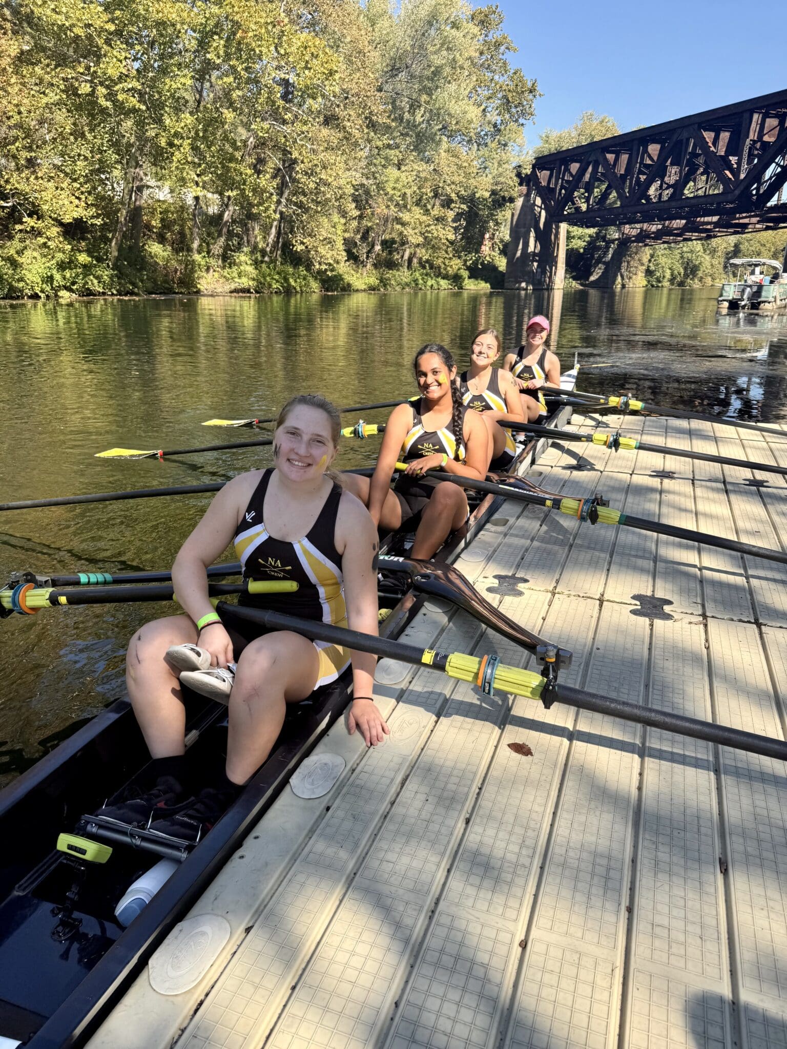 Women's rowing team prepares on sunny river dock, surrounded by trees and bridge.