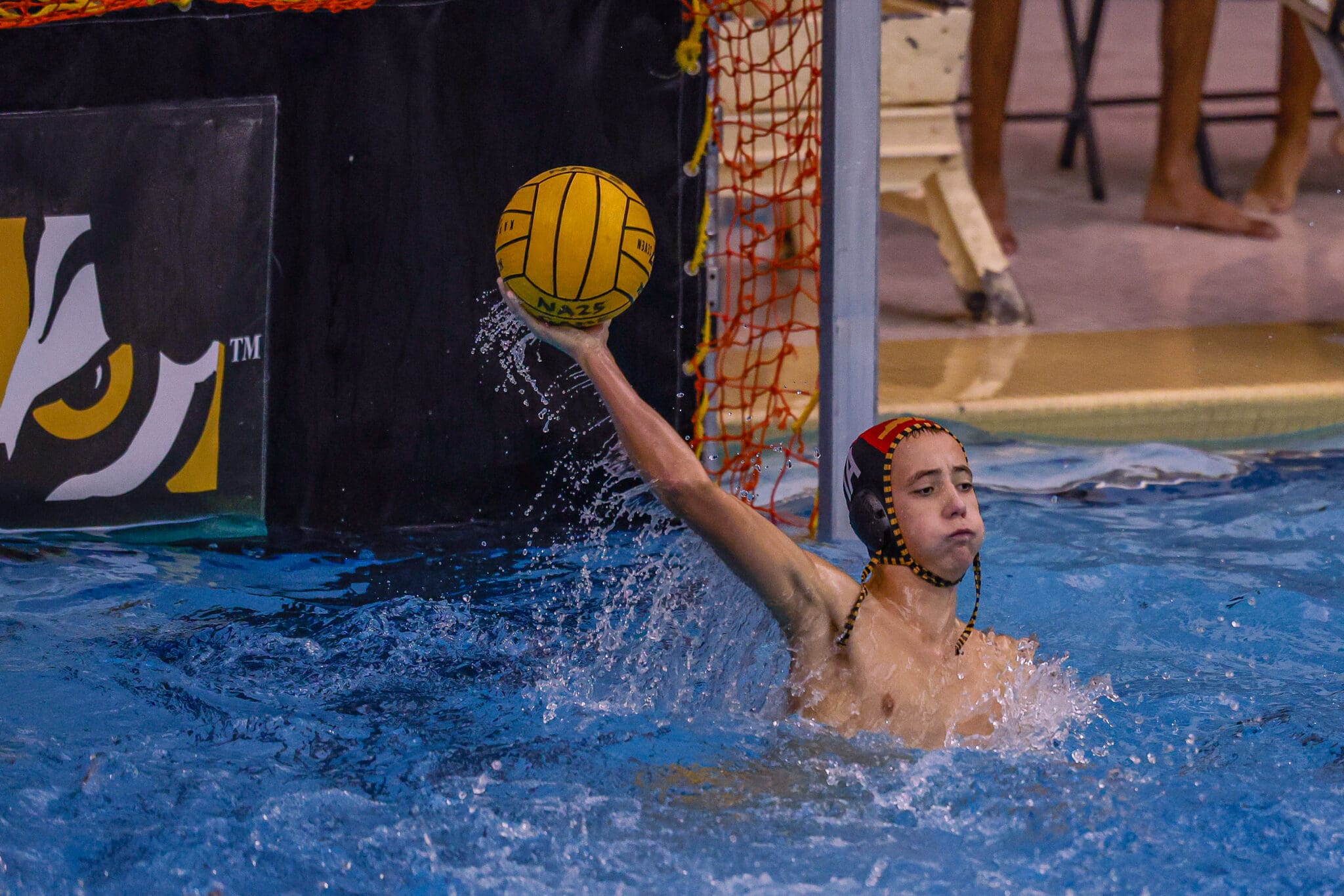 Water polo player prepares to throw a ball by the goal during a match, wearing a helmet and in action mode.