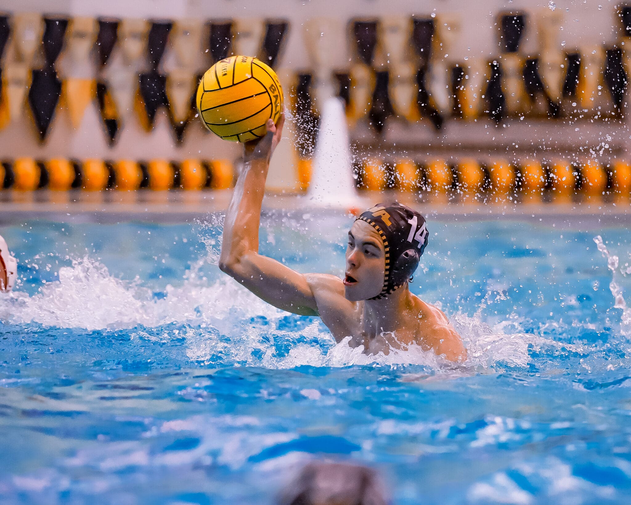 Water polo player in action, preparing to throw the ball during a competitive pool match.