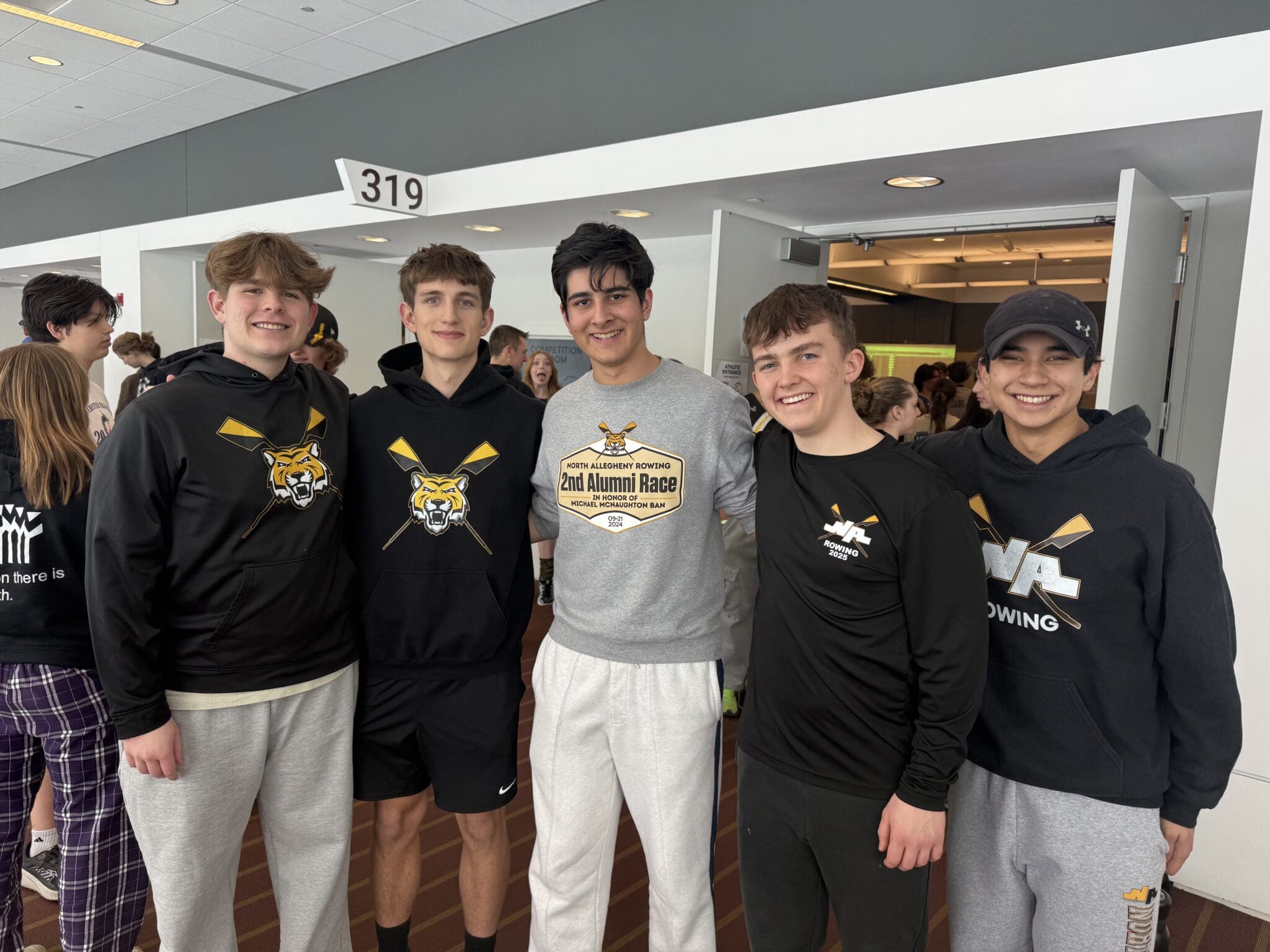 Group of five smiling rowers in team apparel at an alumni race event indoors.