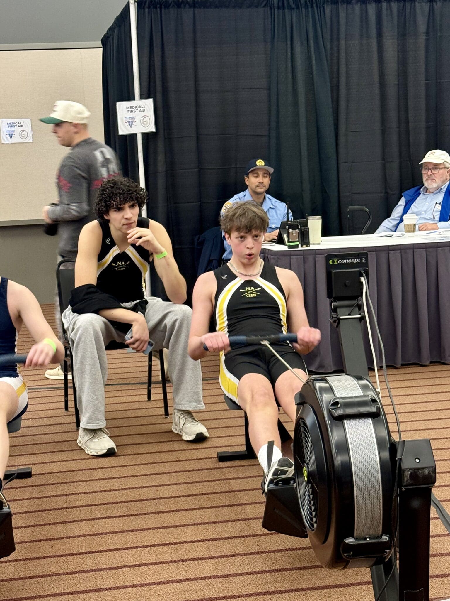 Teen rowing competition indoors with participants focused on the machine and judges observing in the background.