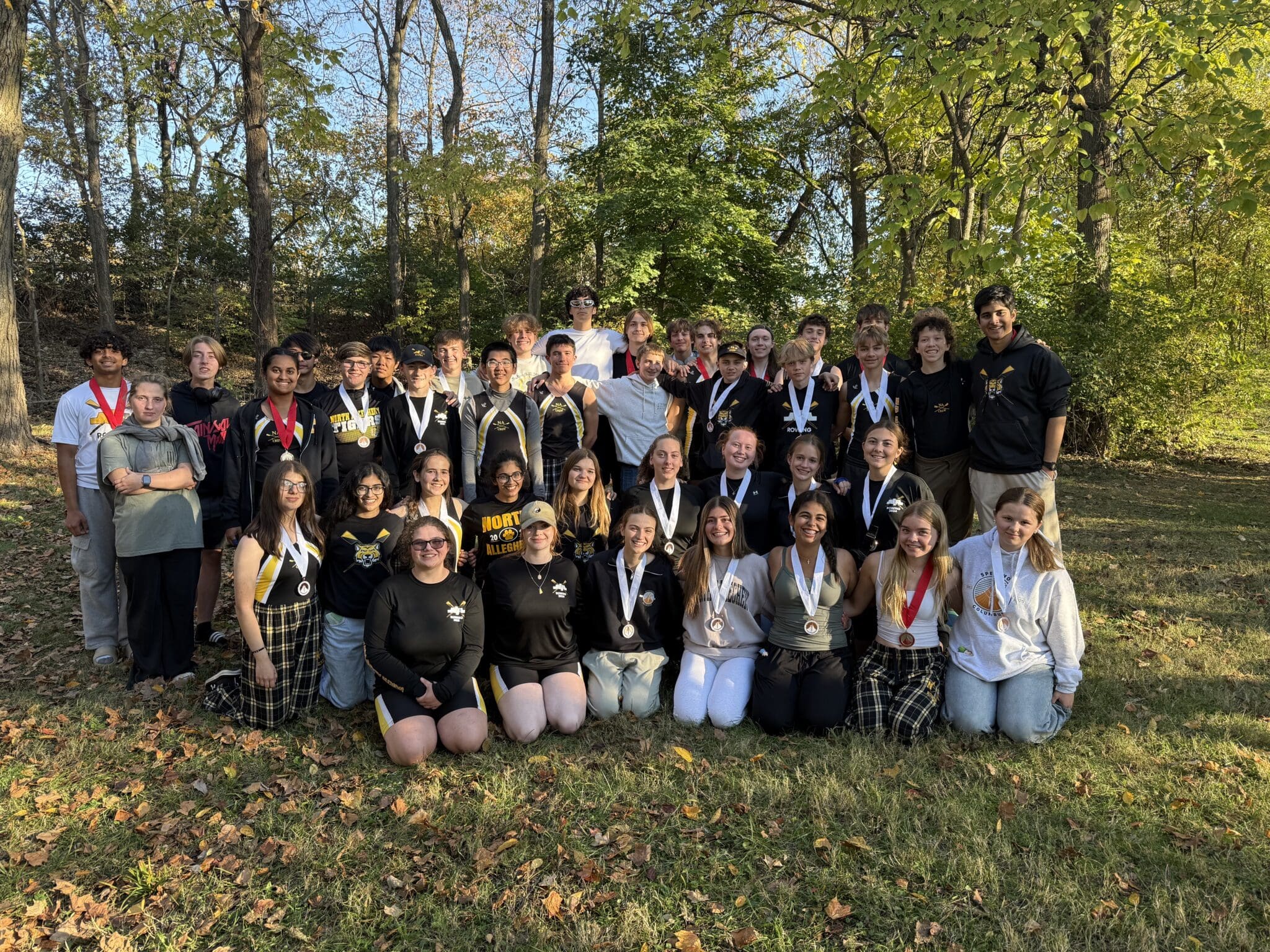 Group of students with medals posing outdoors in a sunny park setting, celebrating an achievement.