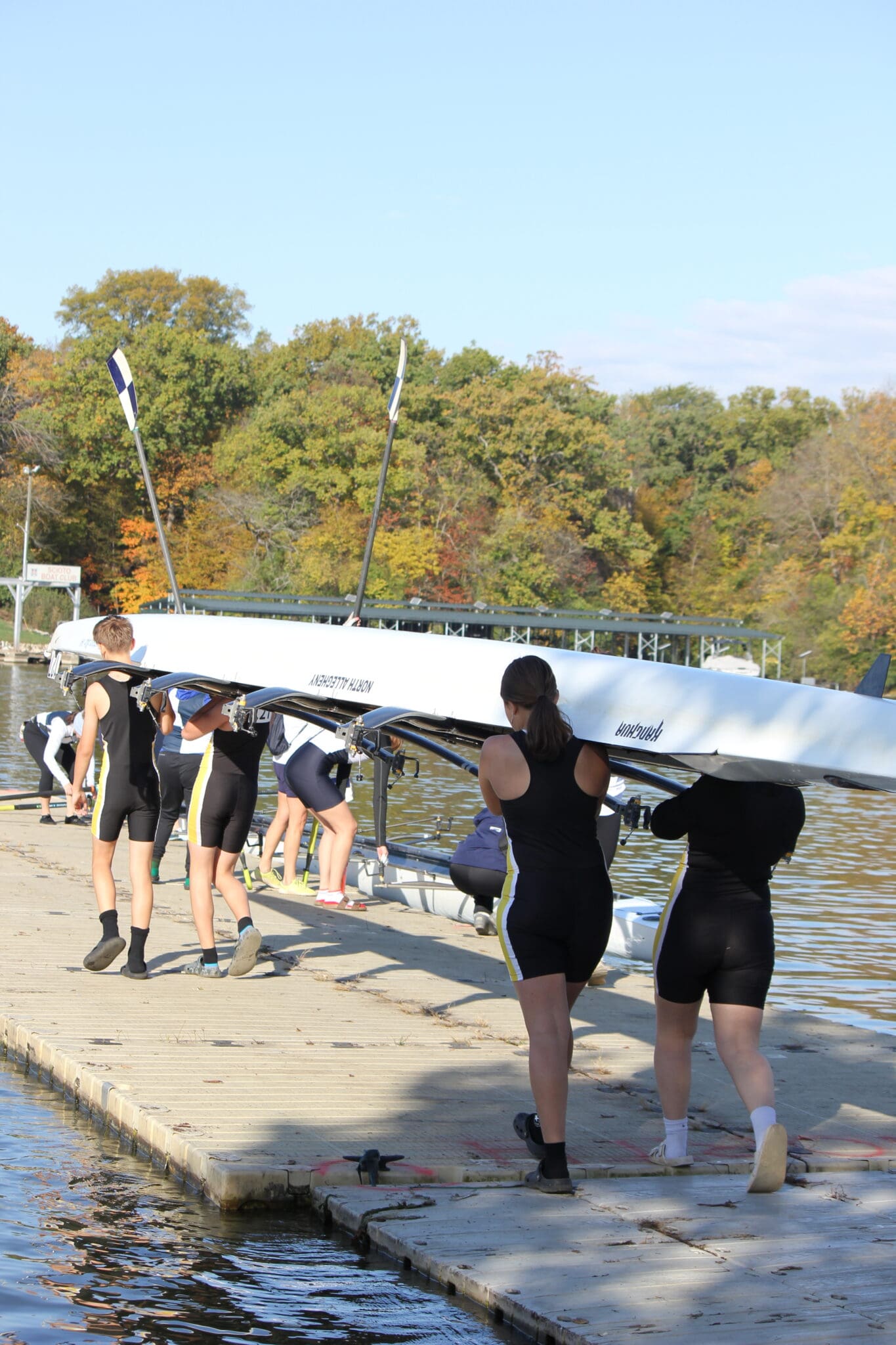 Rowing team carrying boat to water on a sunny day, surrounded by autumn trees.