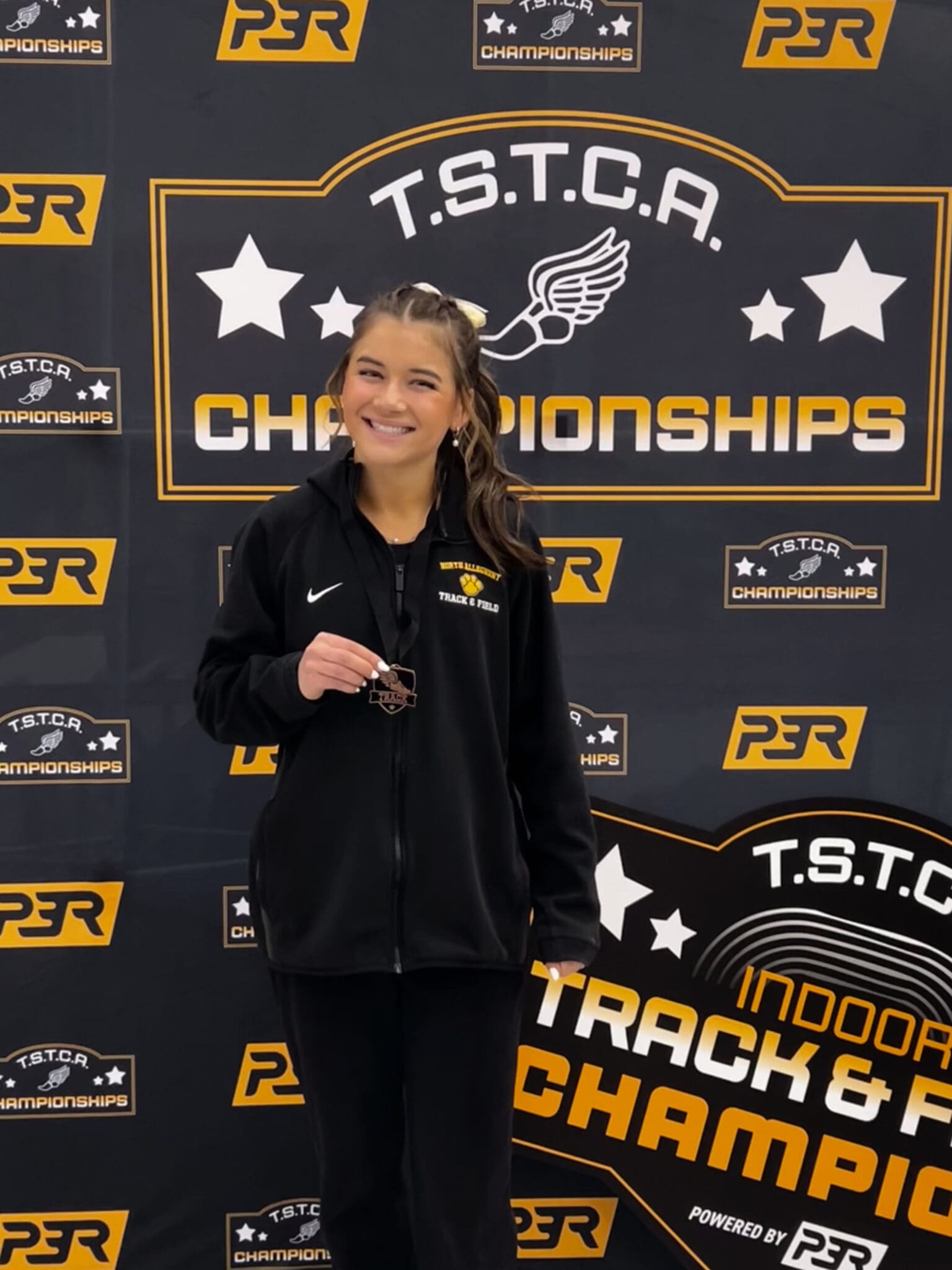 Athlete holding a medal at T.S.T.C.A. Indoor Track & Field Championships backdrop.