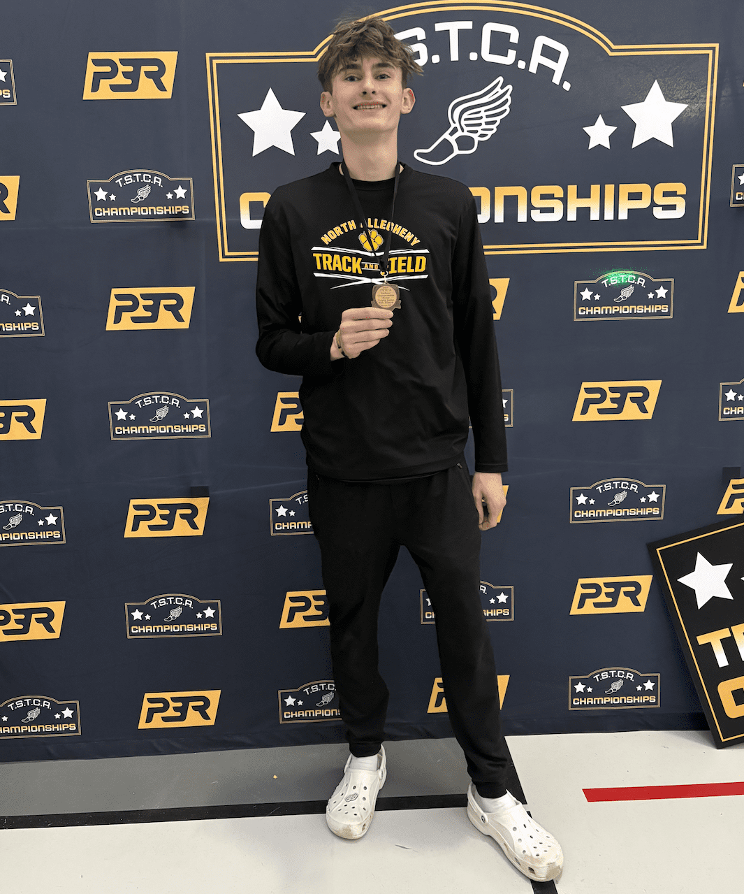 Young athlete holding medal at TSTCA Championships in track and field gear stands smiling against branded backdrop.