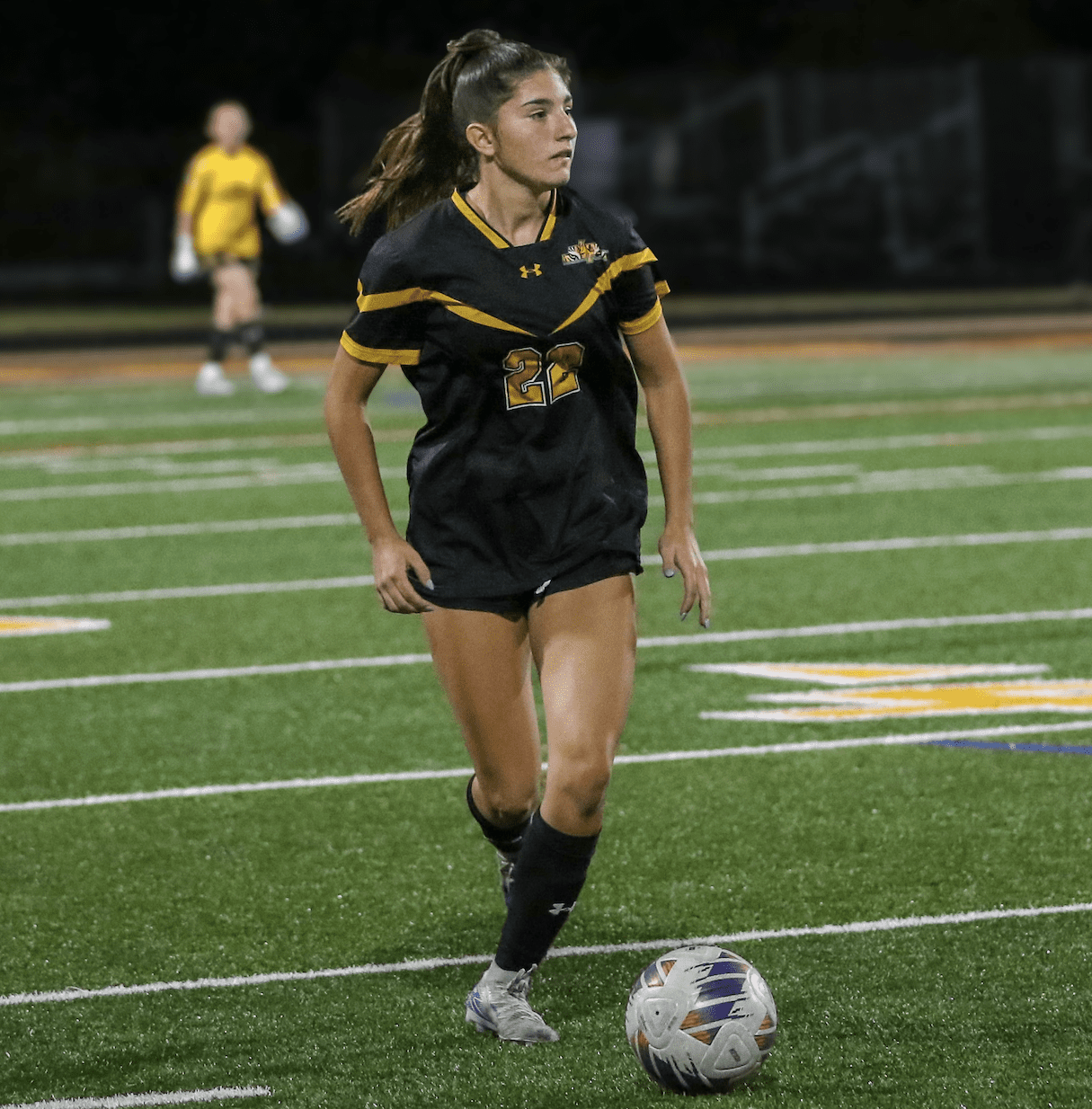 Soccer player in black jersey dribbling on field at night game, with a goalkeeper in the background.