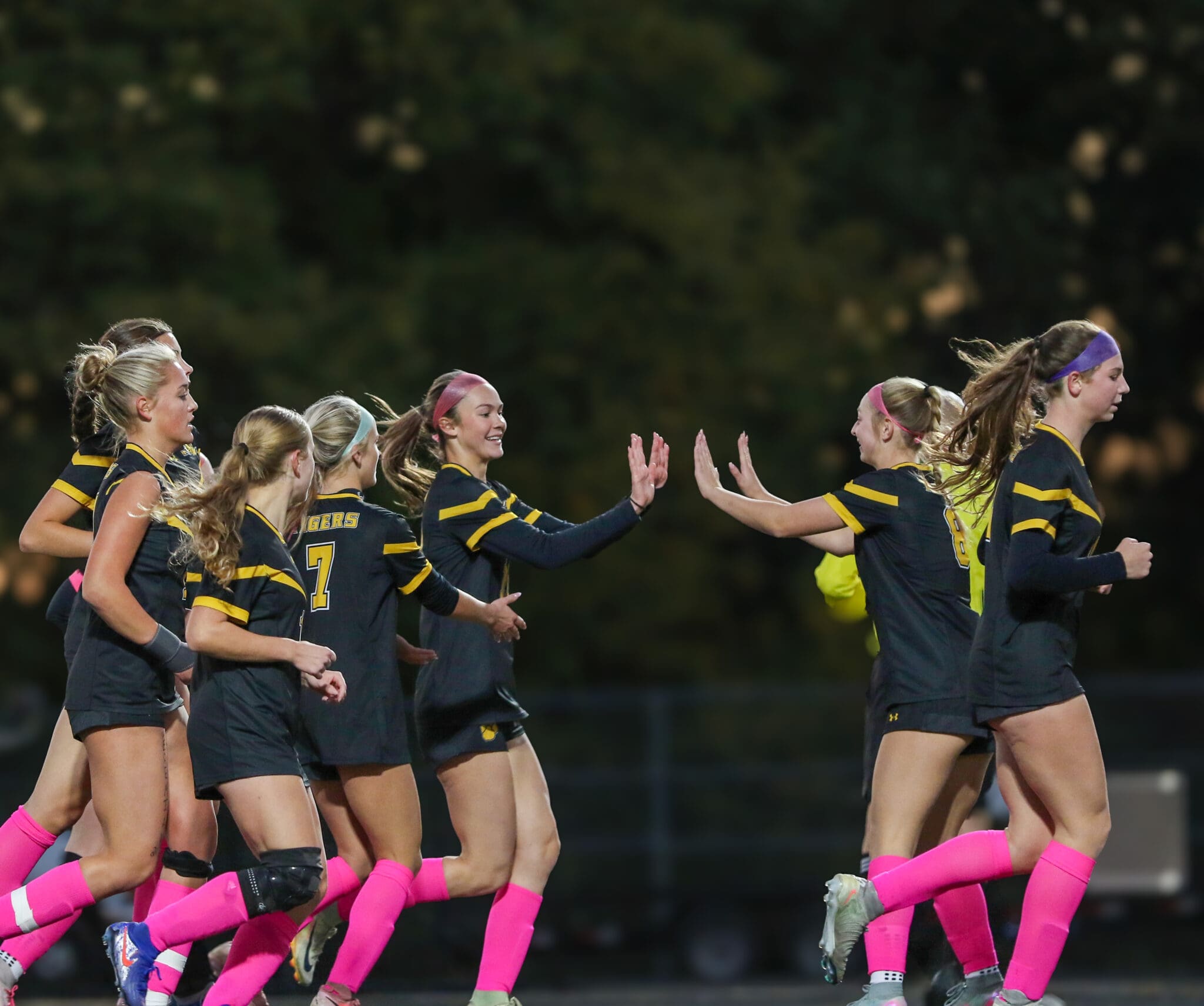 Soccer team in black and pink celebrates a goal, players high-fiving joyfully on the field at night.