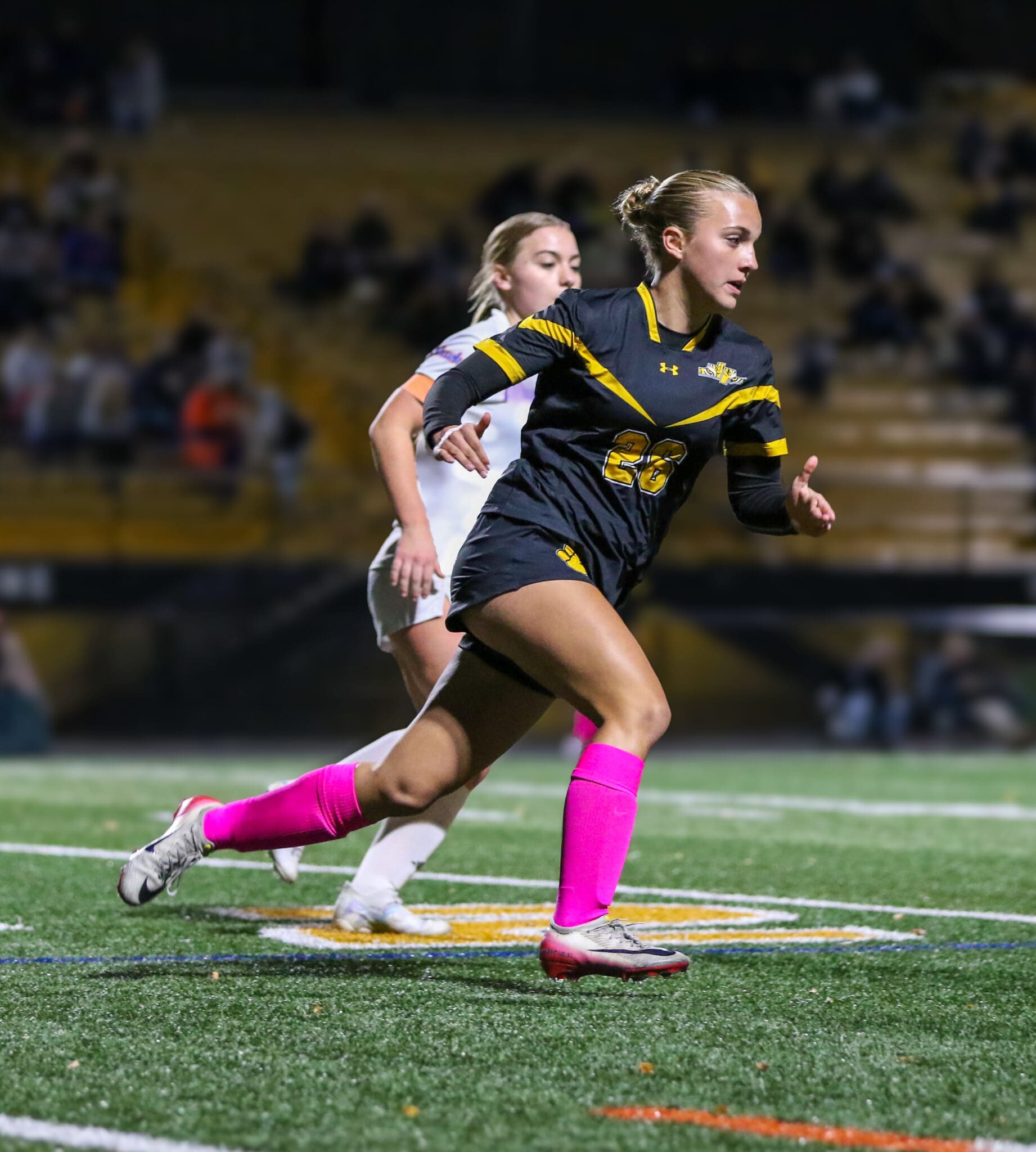 Soccer player in black uniform with pink socks sprinting during a match at night.