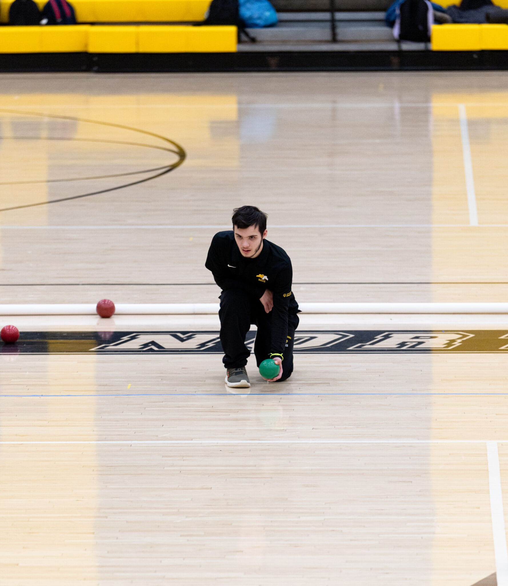 Athlete playing bocce indoors, ready to throw, focused on aiming the green ball.