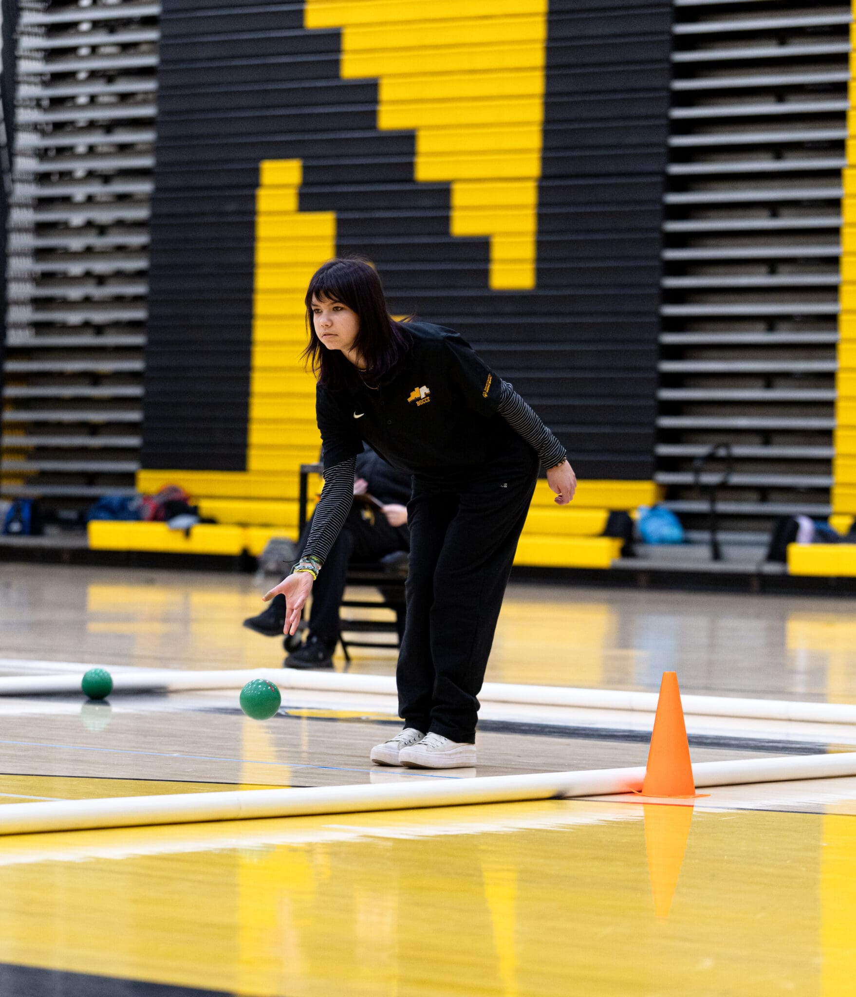 Person in sports attire participates in a bocce game in an indoor gym with yellow and black walls.