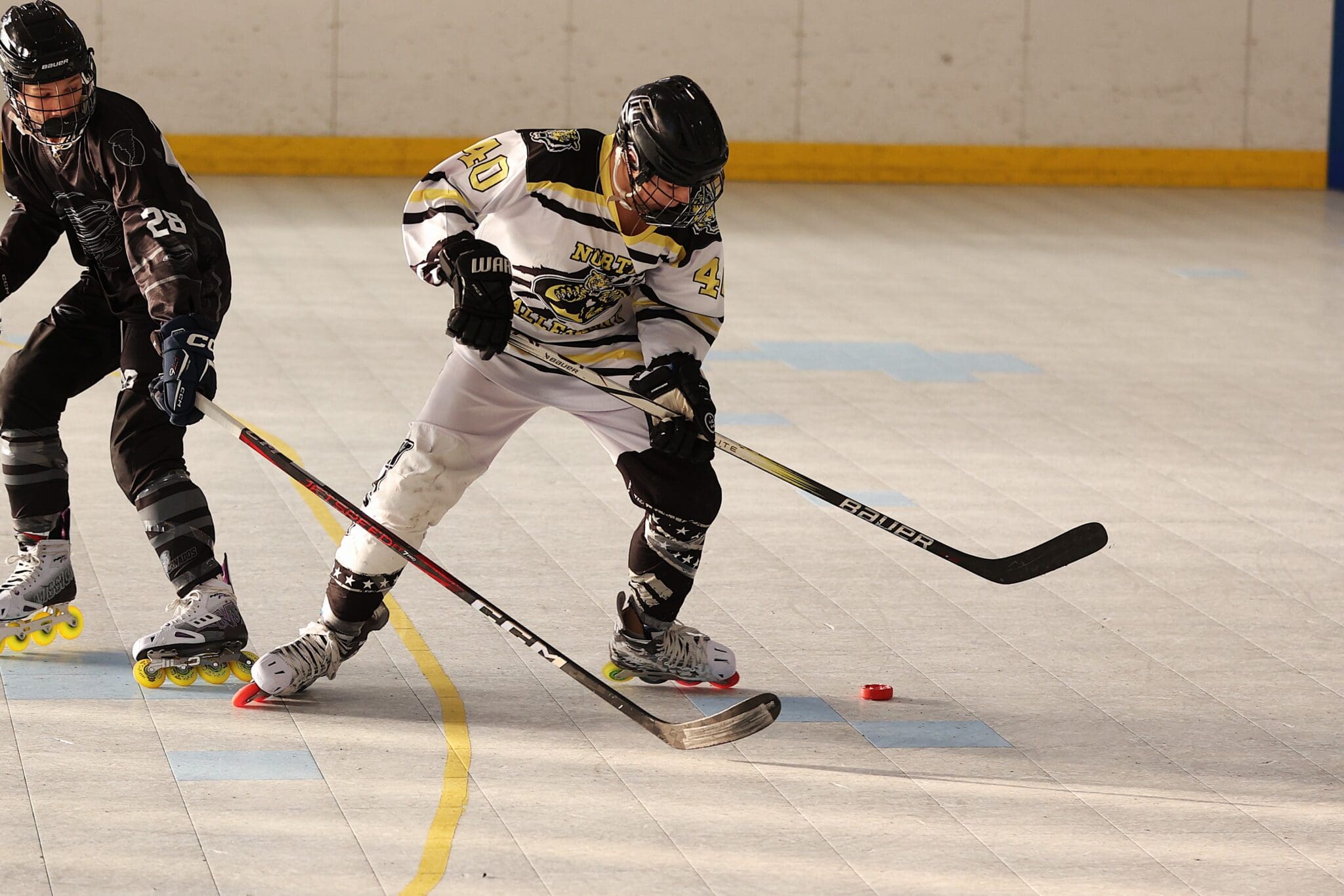 Inline hockey players in intense action on rink, focusing on puck control and teamwork.