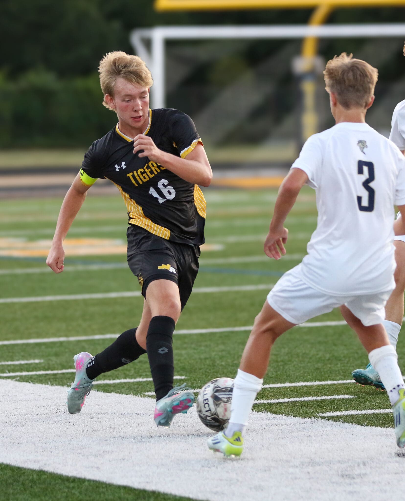 Soccer player in black uniform dribbles past opponent in white on a grassy field during a match.