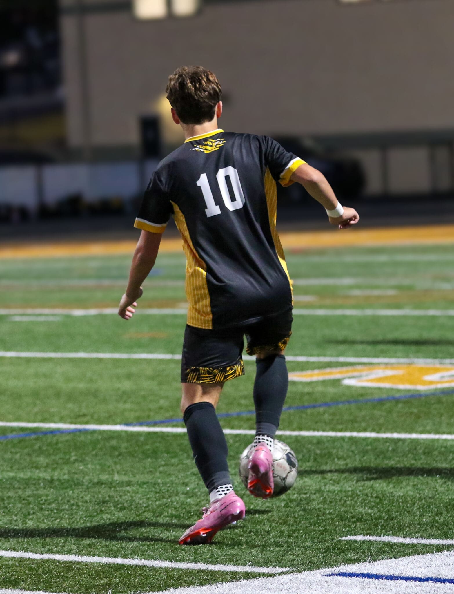 Soccer player in black jersey number 10 dribbling ball on a green field during a nighttime match.