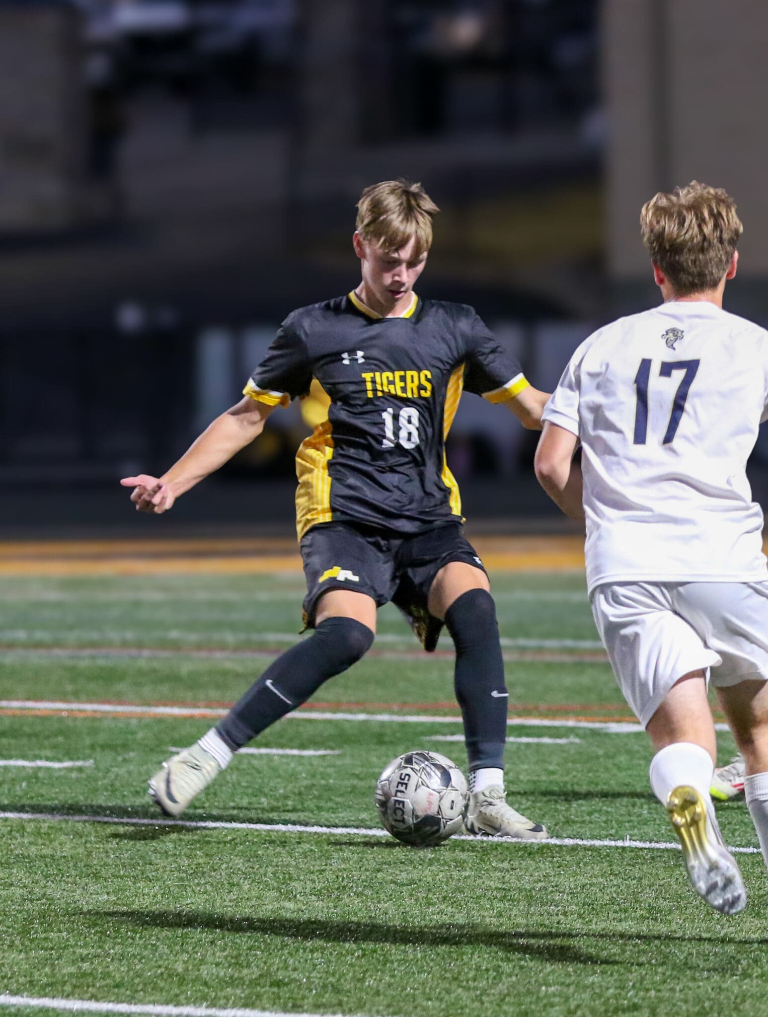 Two soccer players in action during a night game, dribbling on the field, wearing black and white uniforms.