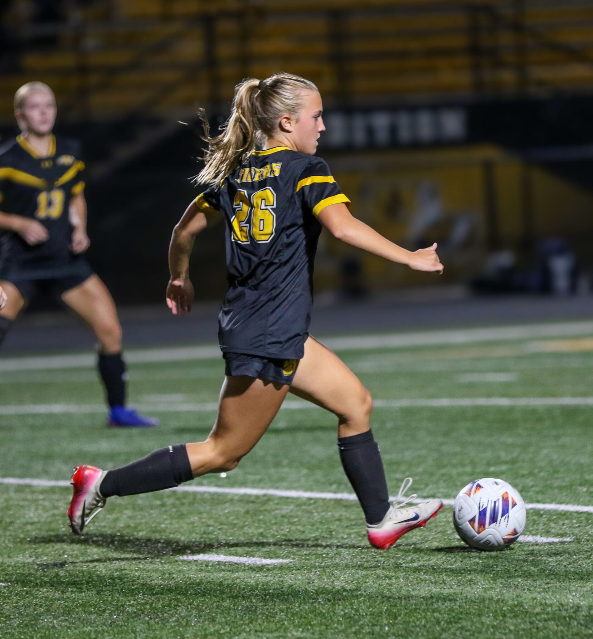 Soccer player in black and yellow uniform dribbling the ball on a field during a night game.