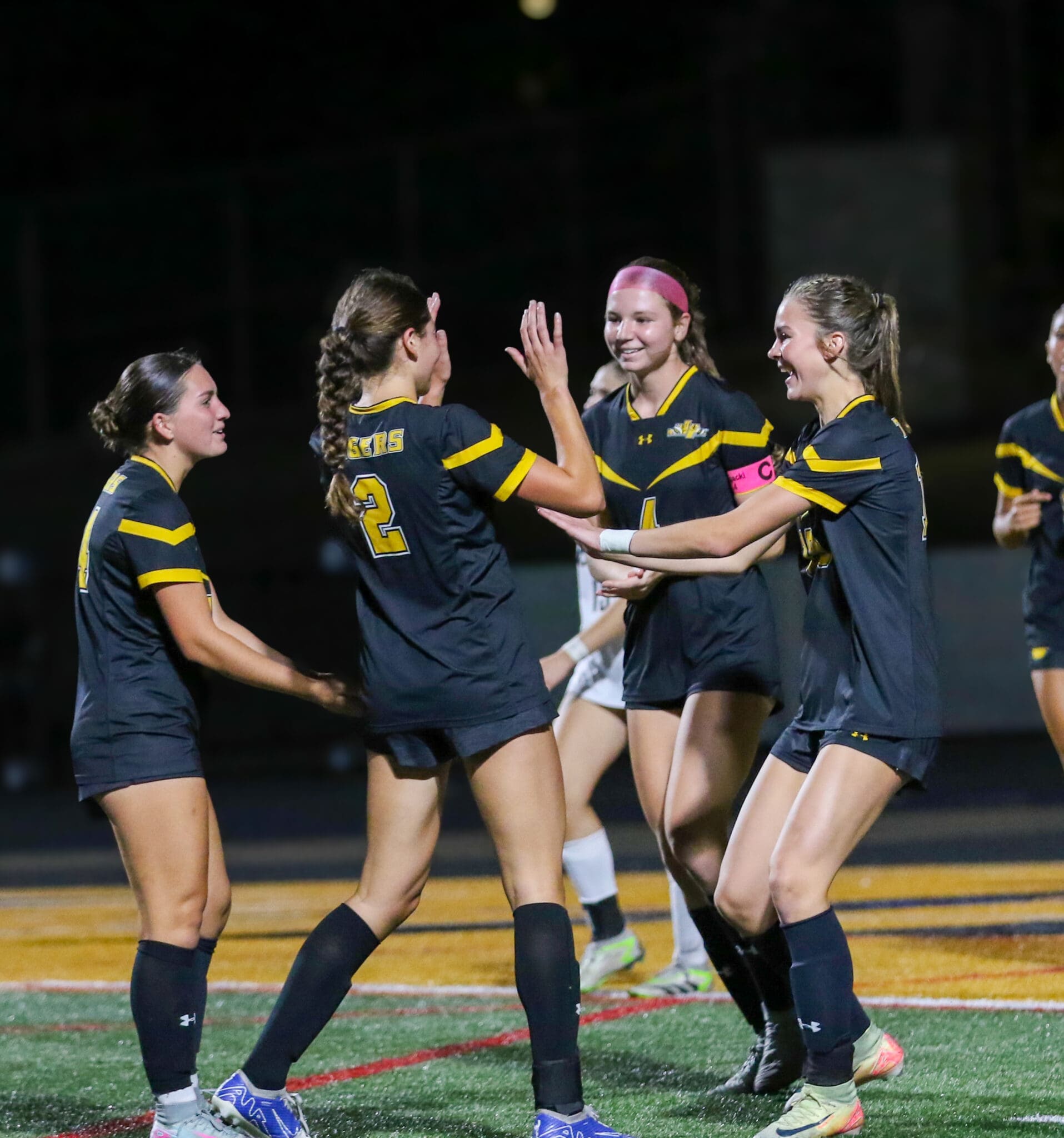 Four female soccer players in black jerseys celebrating on the field at night.