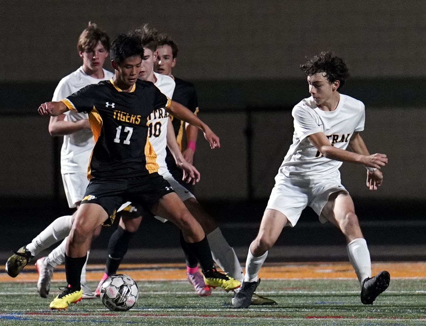 High school soccer match action shot, players competing for the ball under stadium lights.