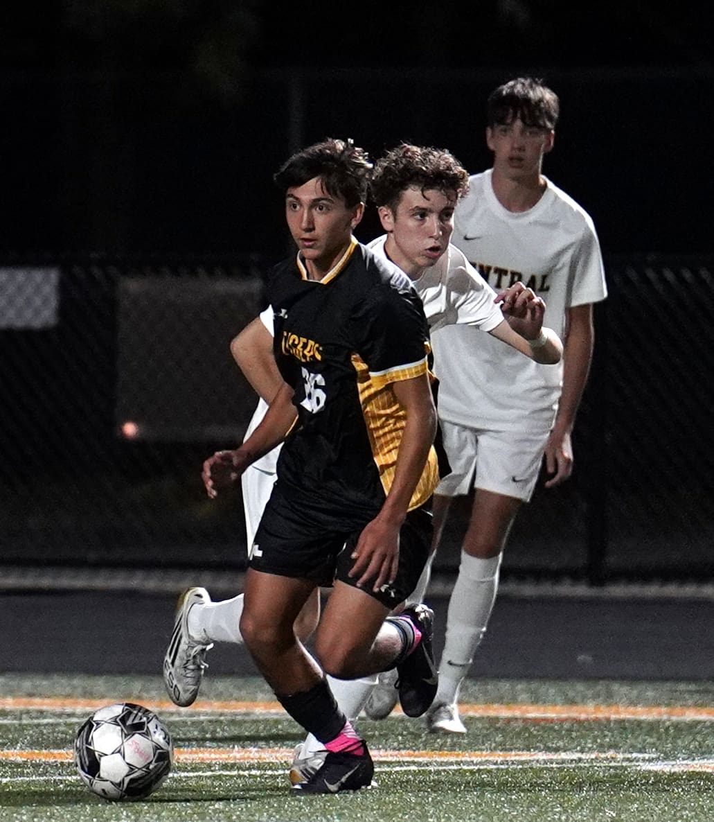 Youth soccer match at night, player in black uniform controls ball while being closely defended.