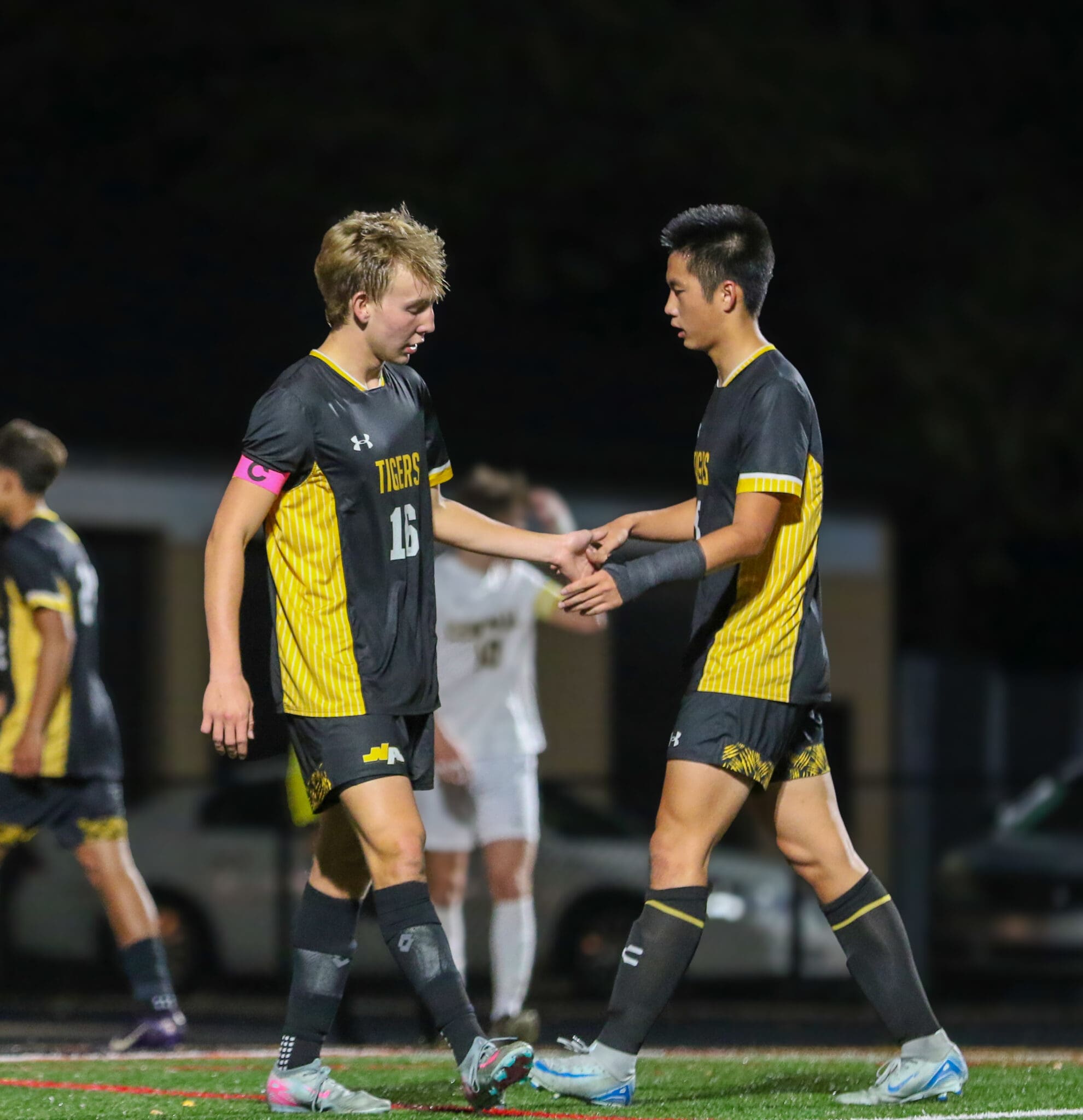 Two soccer players in black and yellow jerseys shaking hands on the field during a night game.