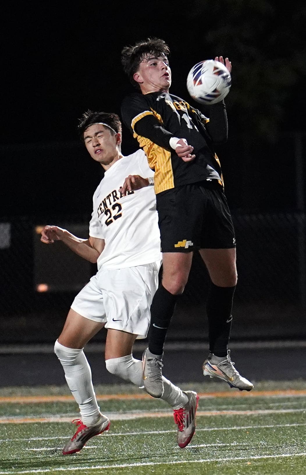 Soccer players in mid-air action during a night game, one controlling the ball while the other prepares to defend.