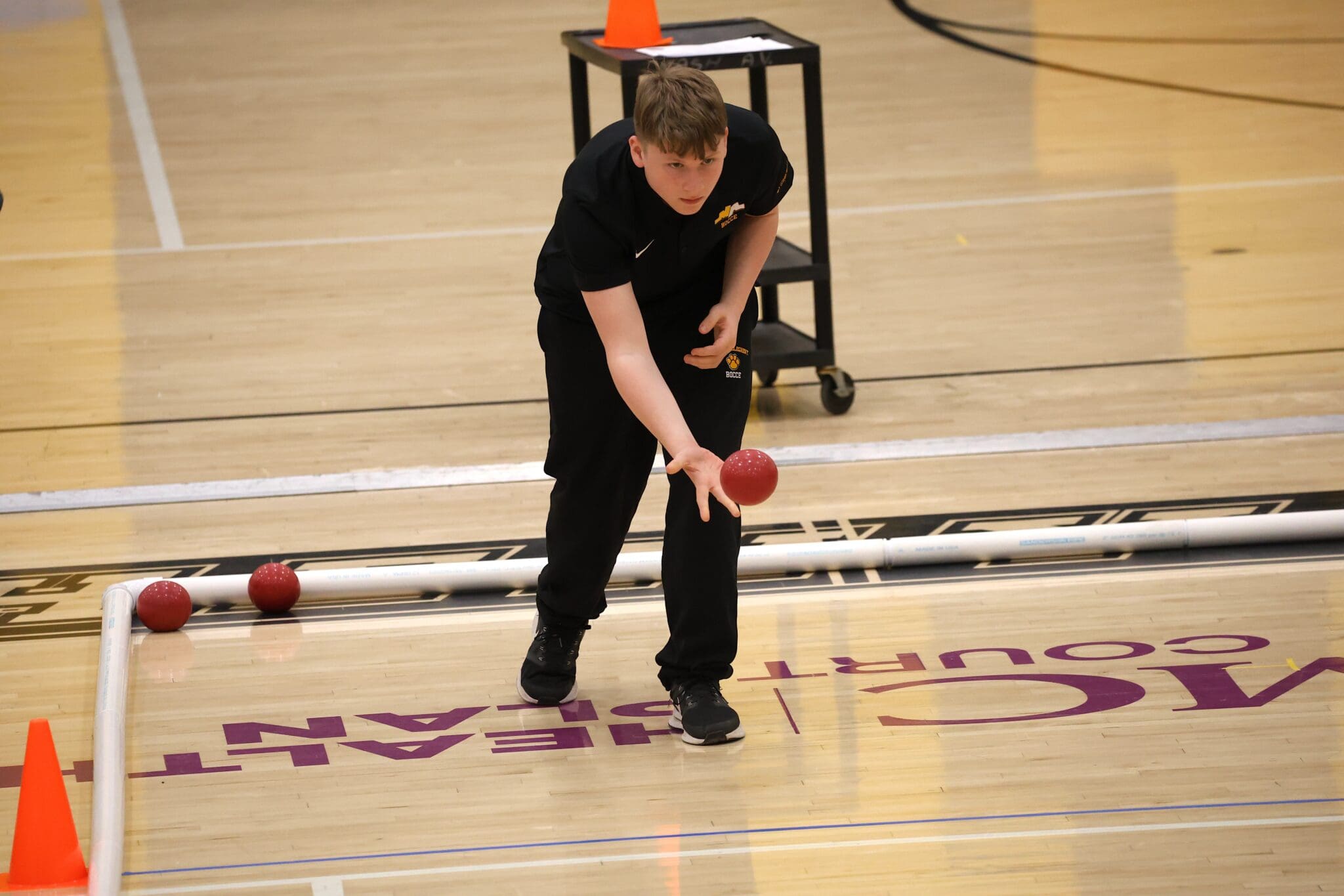 Person playing boccia on an indoor court, focused on throwing a red ball towards a marked area.