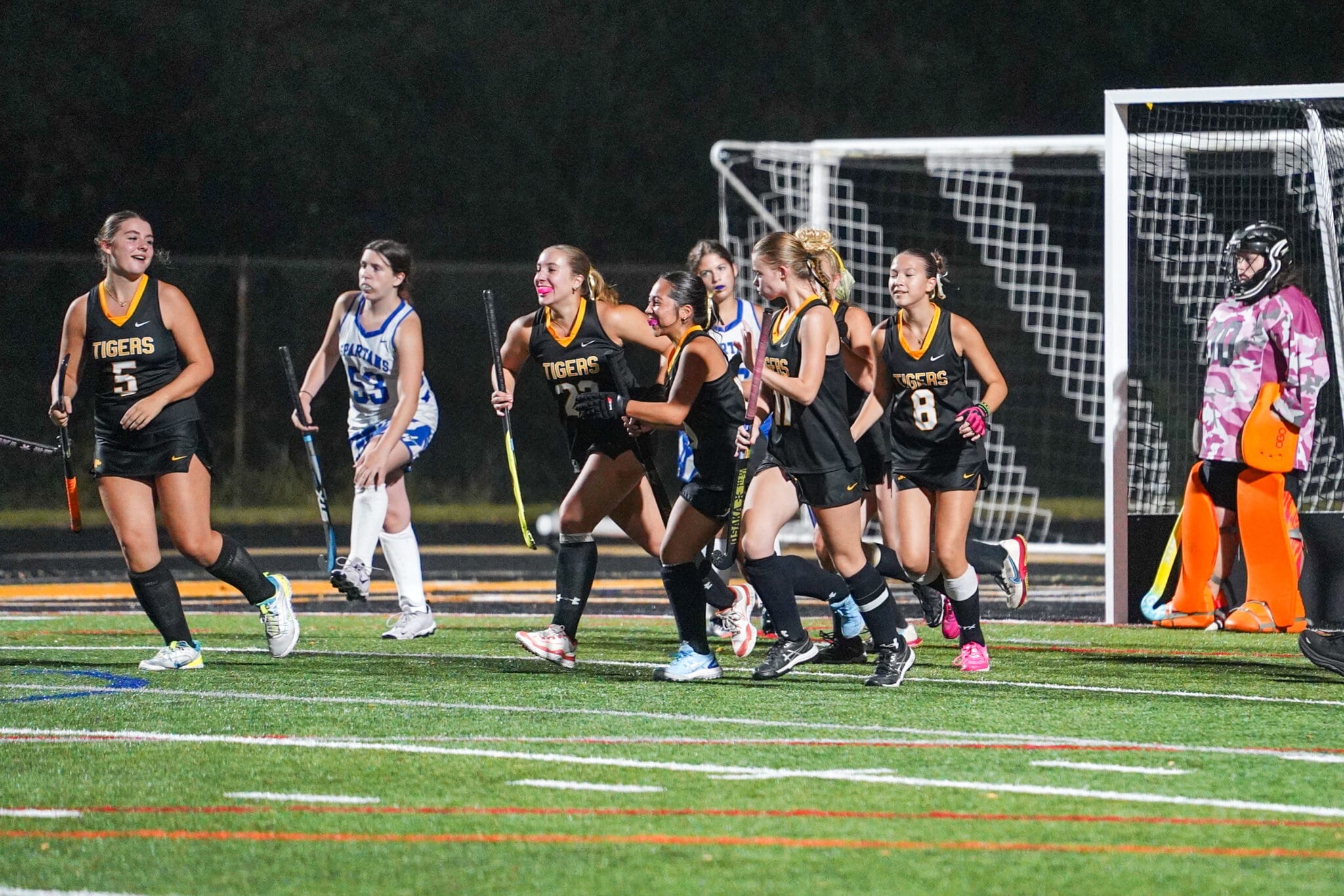 Field hockey team celebrating a goal during a night match on a sports field.