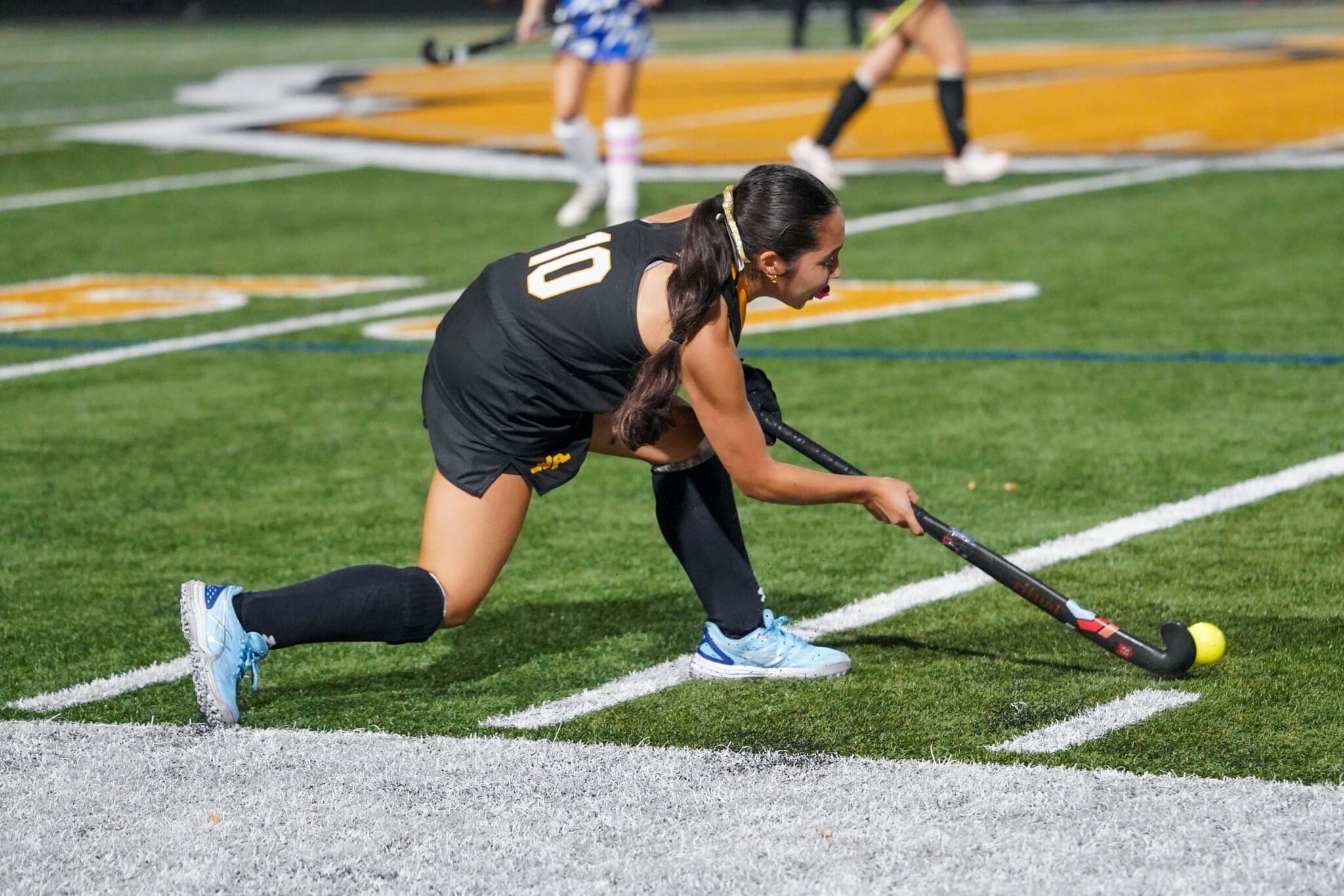 Field hockey player in black uniform preparing to hit ball during night game on artificial turf field.