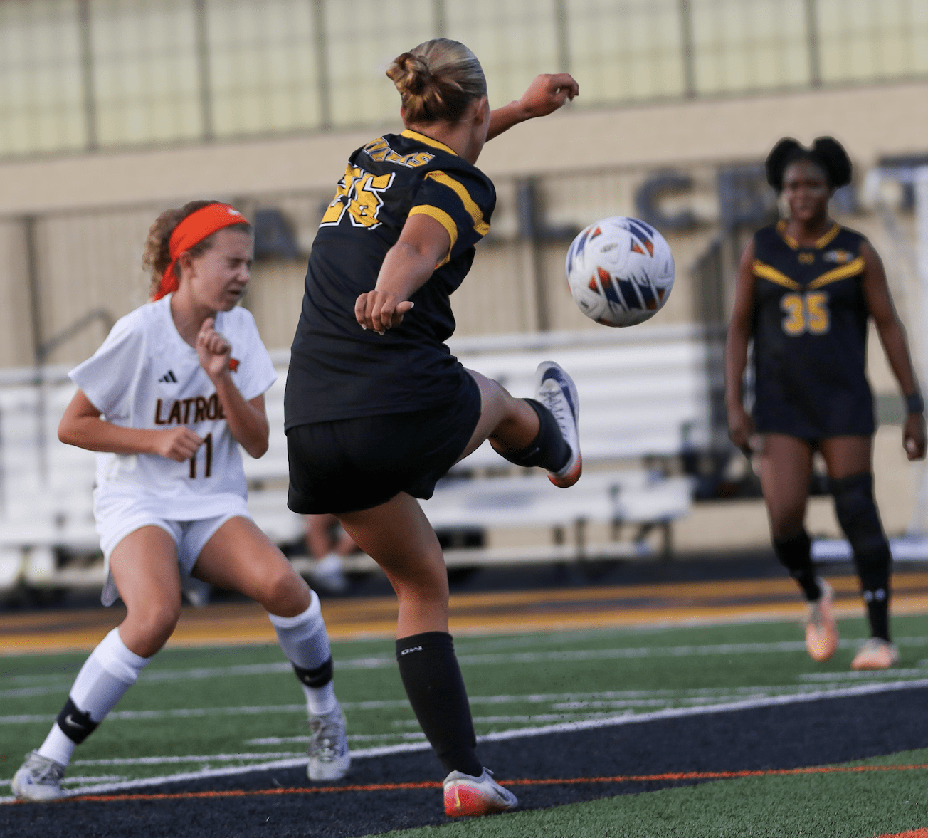 Girls' soccer match action shot with player kicking ball, opponents ready to intercept on a football field.