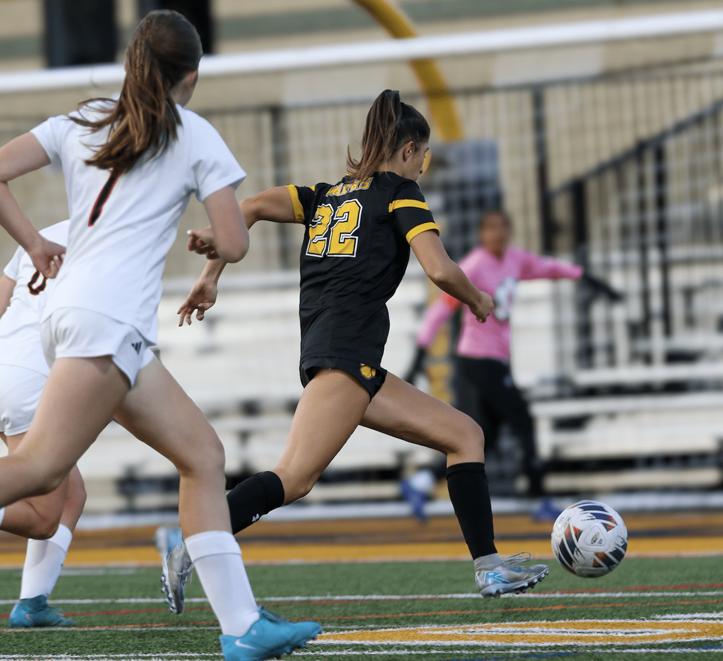 Soccer player in black jersey dribbles past opponent in white, action-packed game moment on the field.