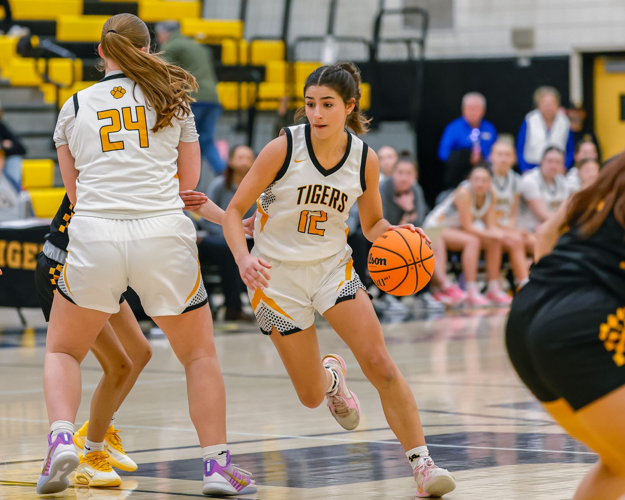 Basketball player dribbles during a game, wearing a white Tigers uniform with number 12.