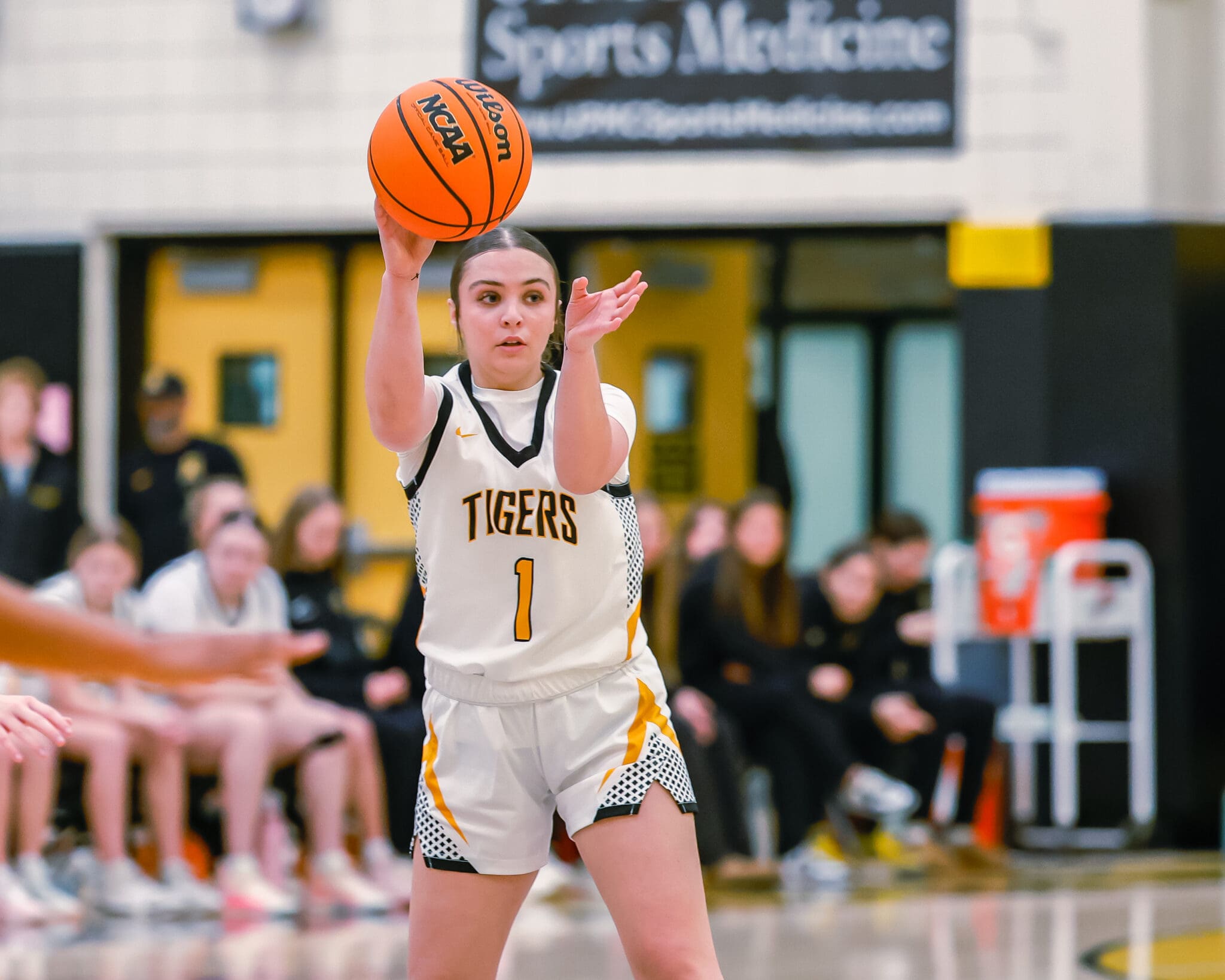 Basketball player in action, passing the ball during a game in a gymnasium setting.