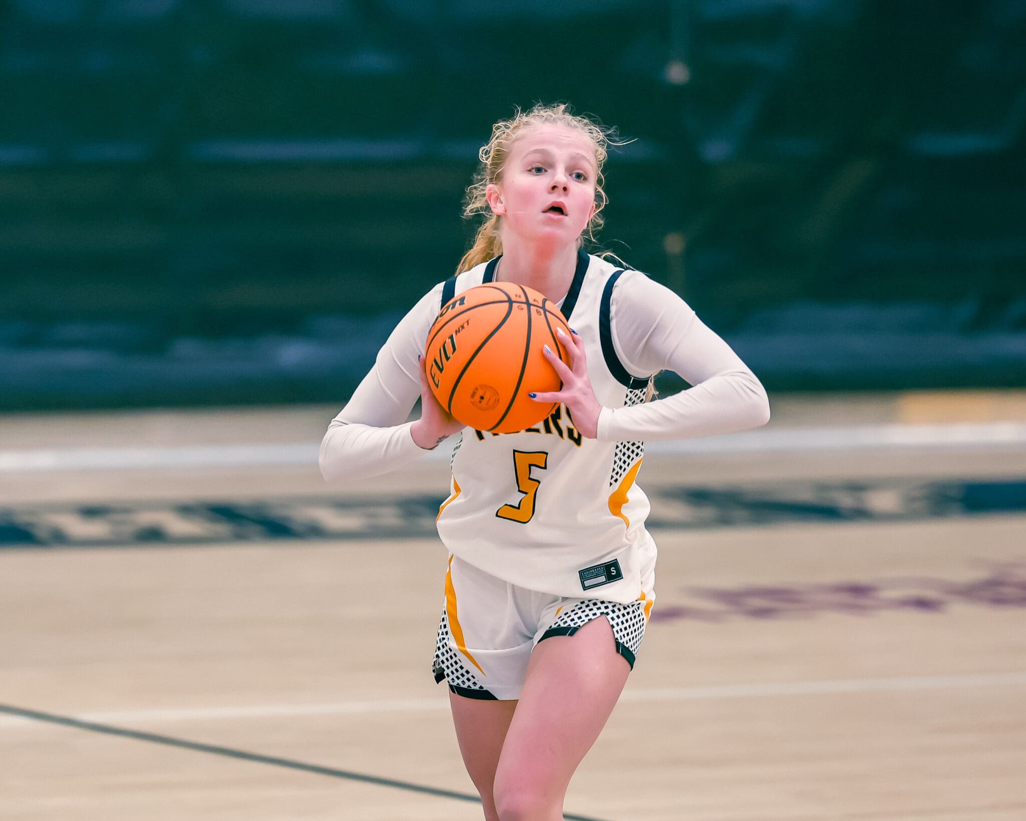 Basketball player in action, wearing number 5 jersey, prepares to pass the ball on the court.