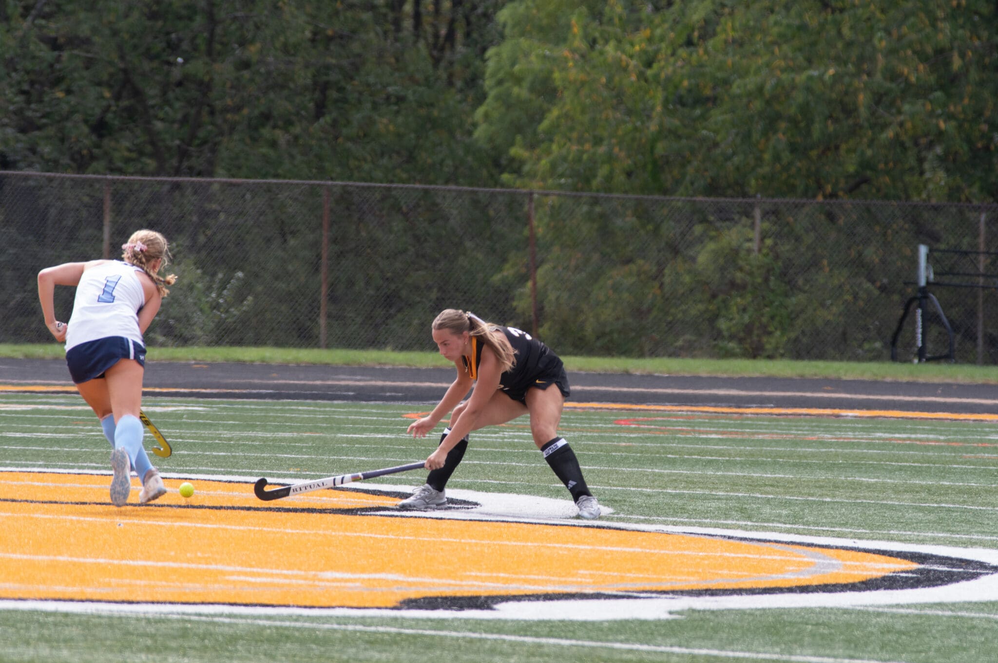 Two field hockey players compete intensely on a grass field during a sunny match.
