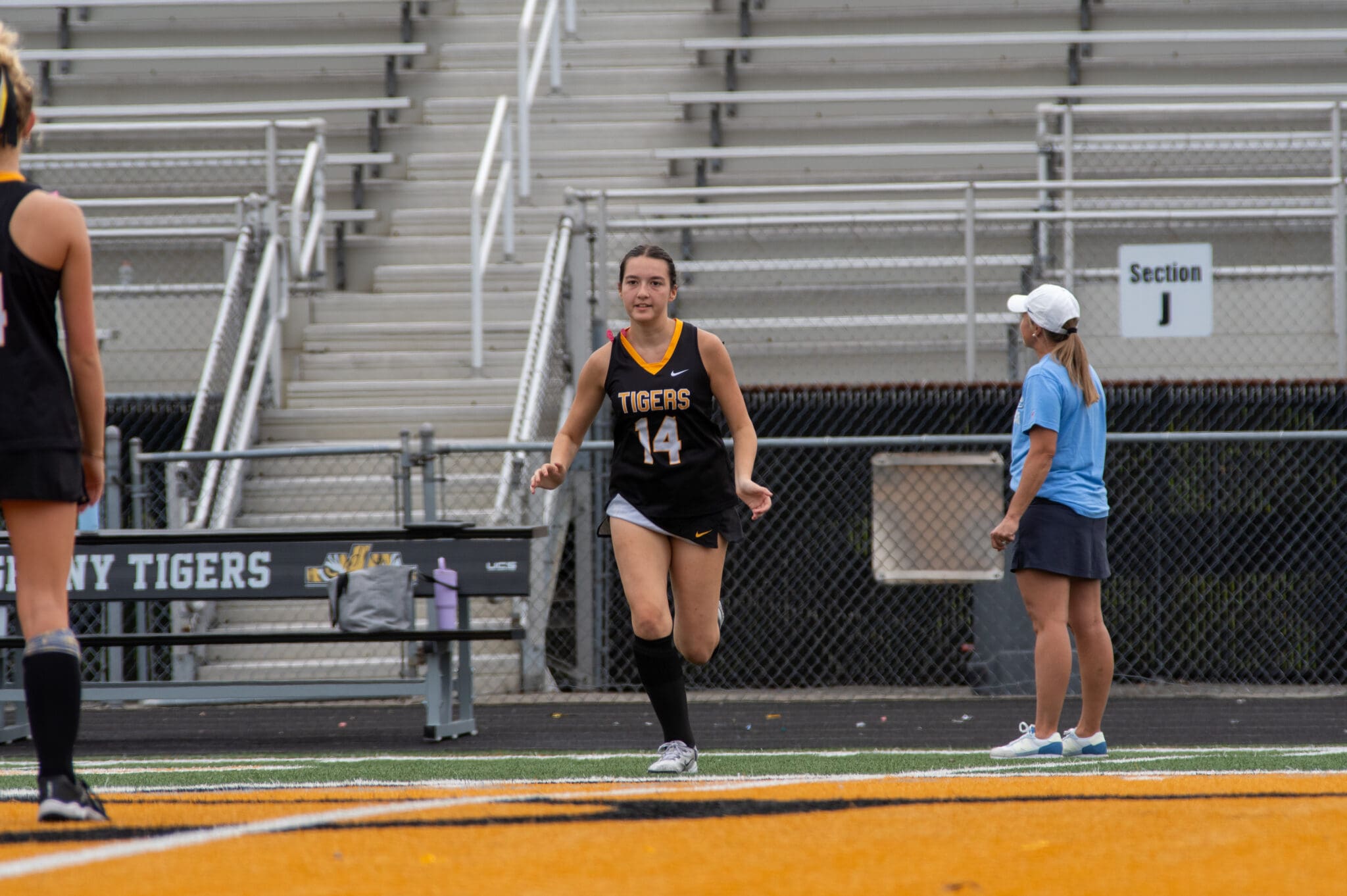 Female field hockey player in action on the field with coach watching in sunny stadium setting.