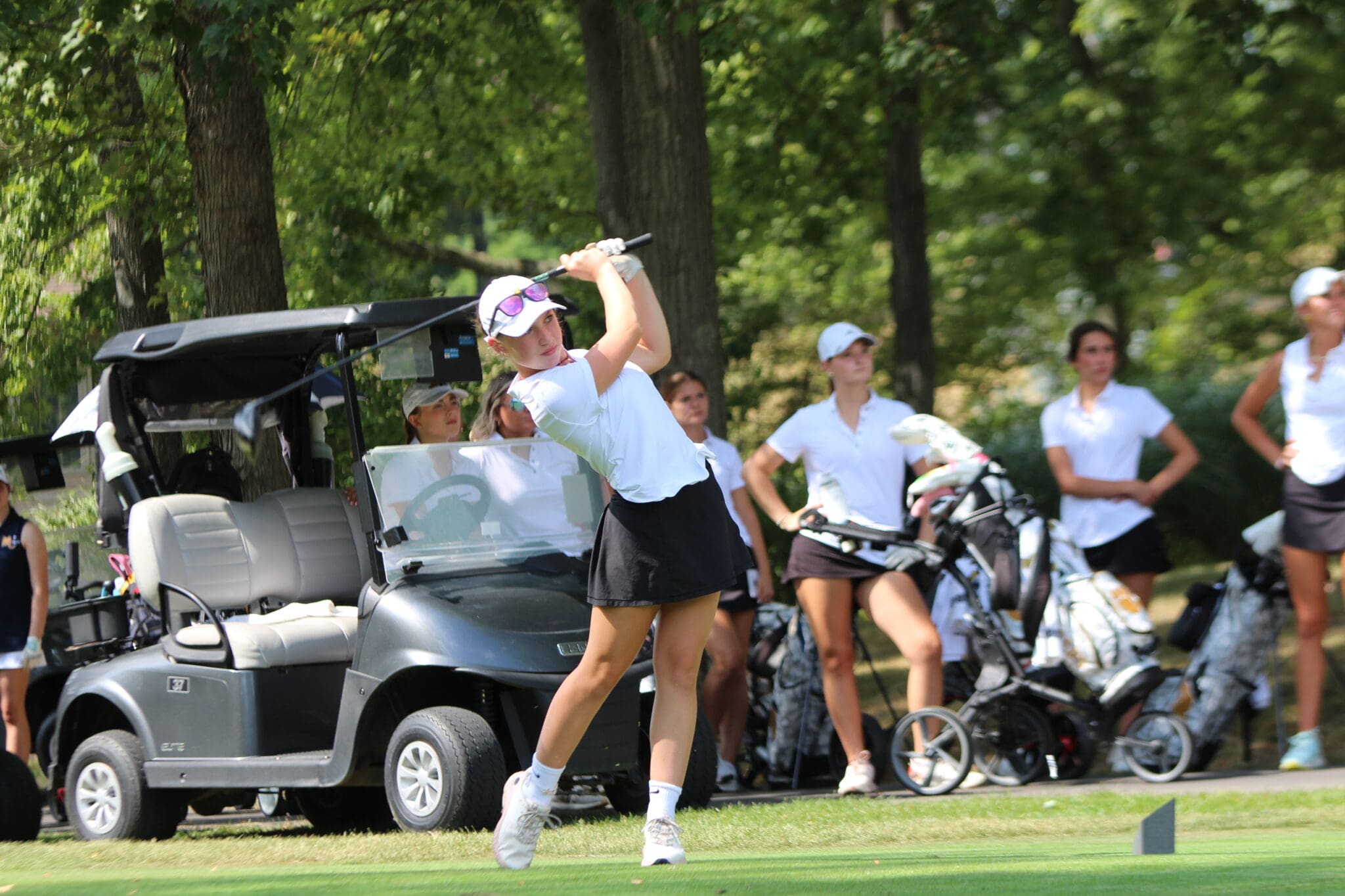 Golfer tees off at lush golf course, joined by teammates and golf cart under trees.