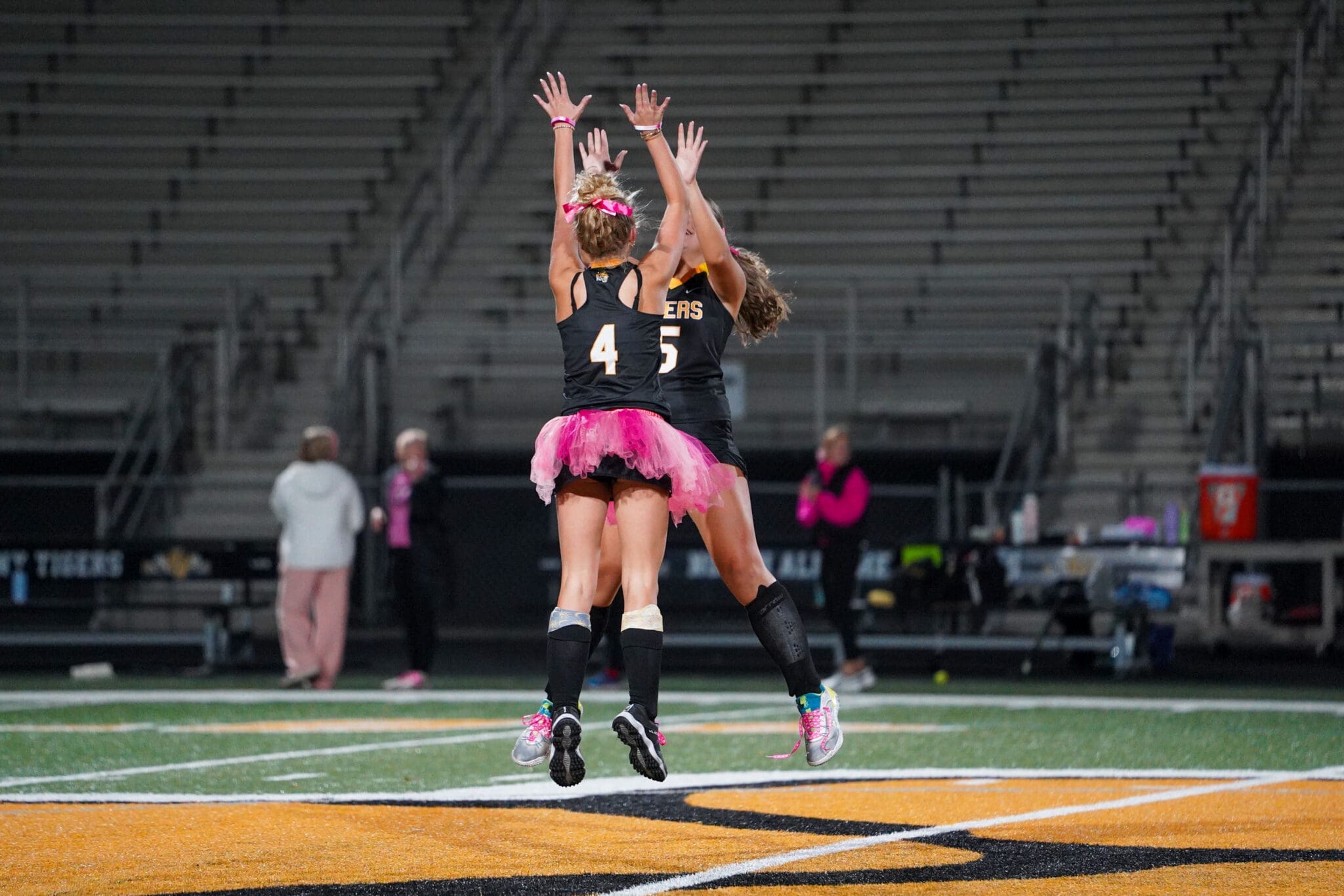 Two field hockey players in black jerseys and pink tutus celebrating with a jump on the field.