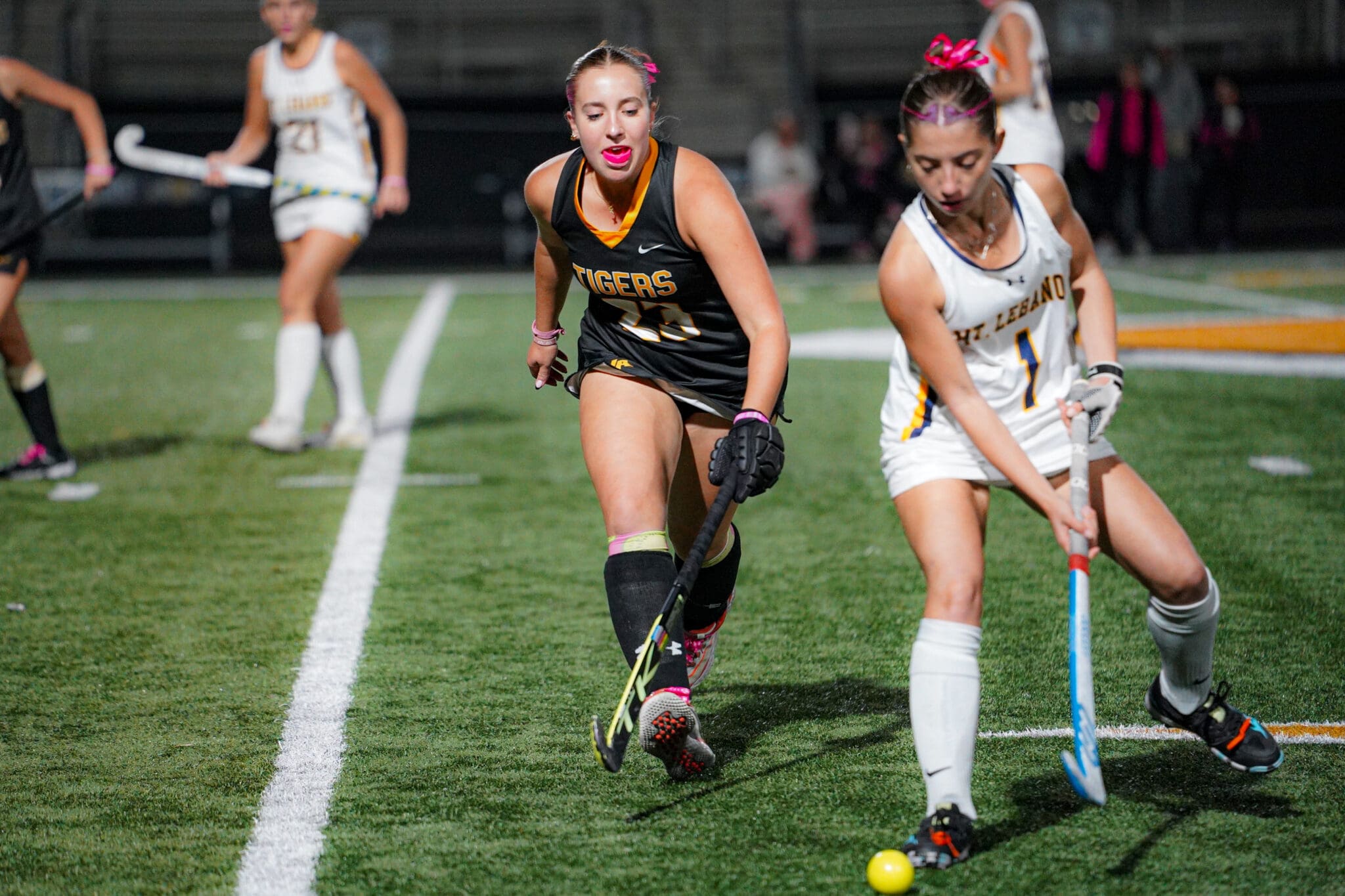 Two female field hockey players compete at night on a green field.