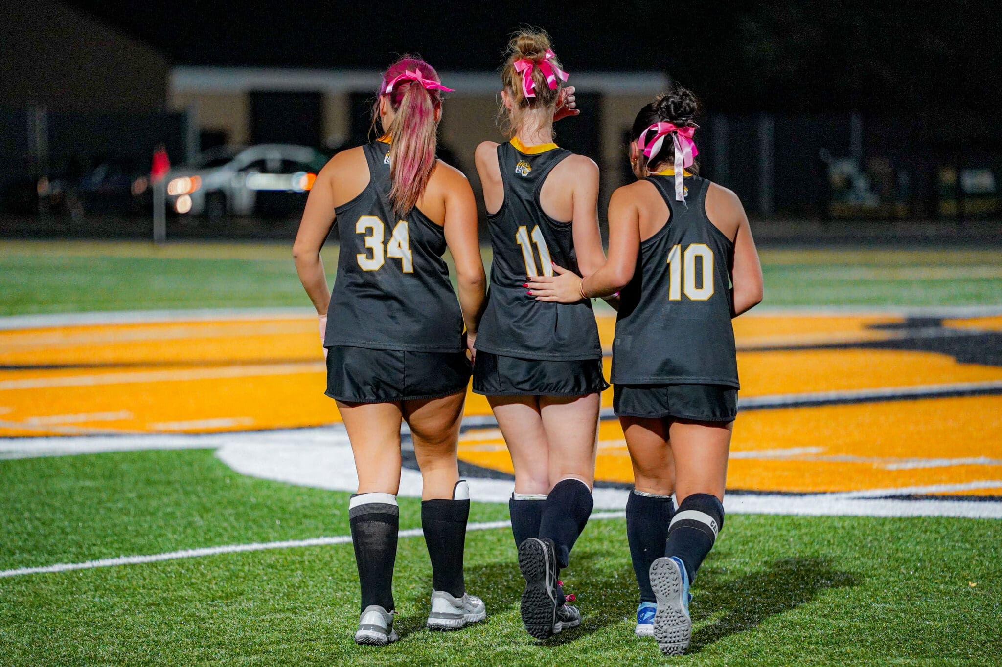 Three female field hockey players with pink ribbons walk together on the field wearing black uniforms.