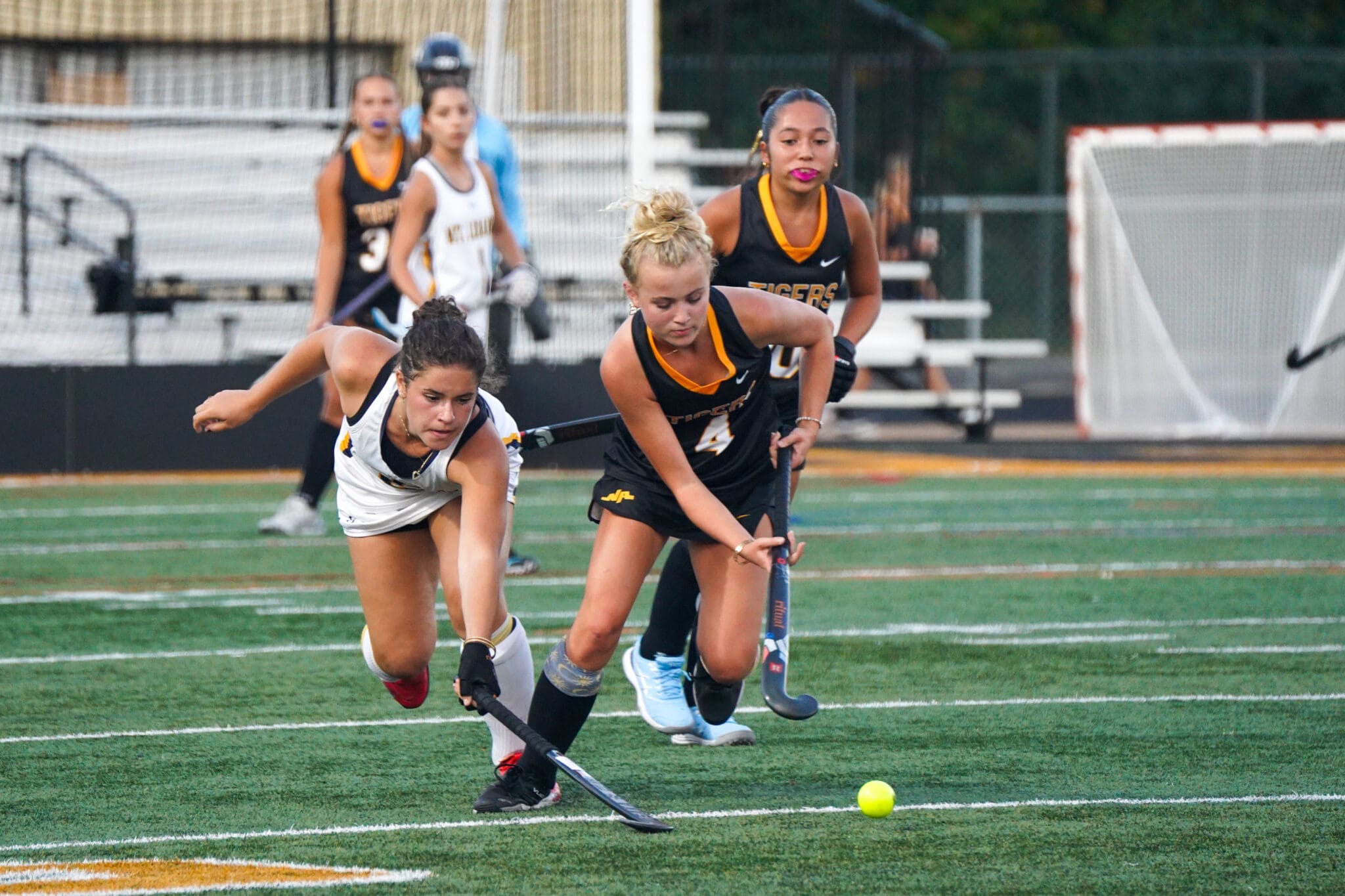 Girls playing field hockey, two players competing for the ball on a green field, intense match action captured.