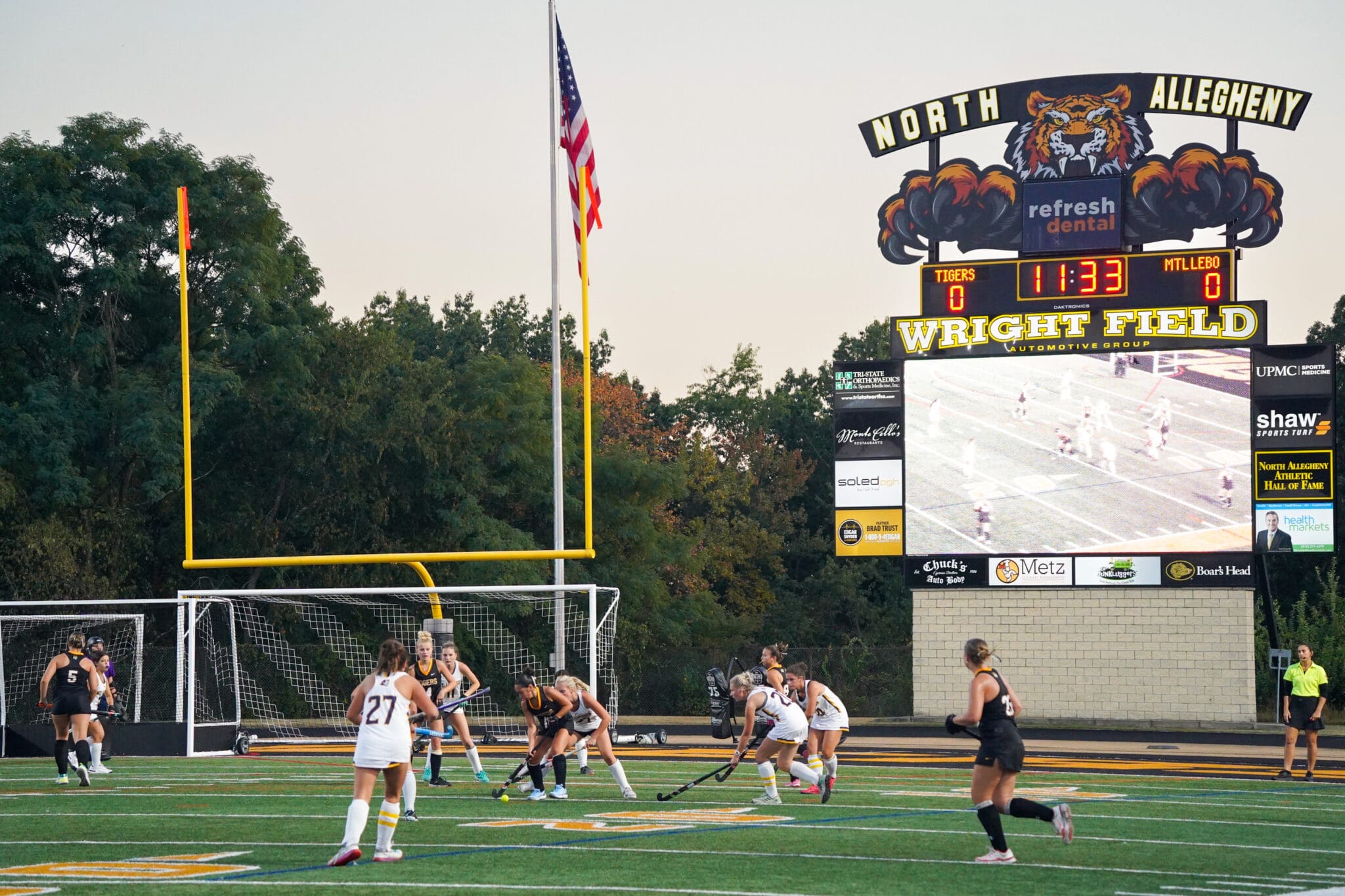 Field hockey game at Wright Field, players in action, scoreboard displaying 0-0, North Allegheny Tigers vs MTLebo.