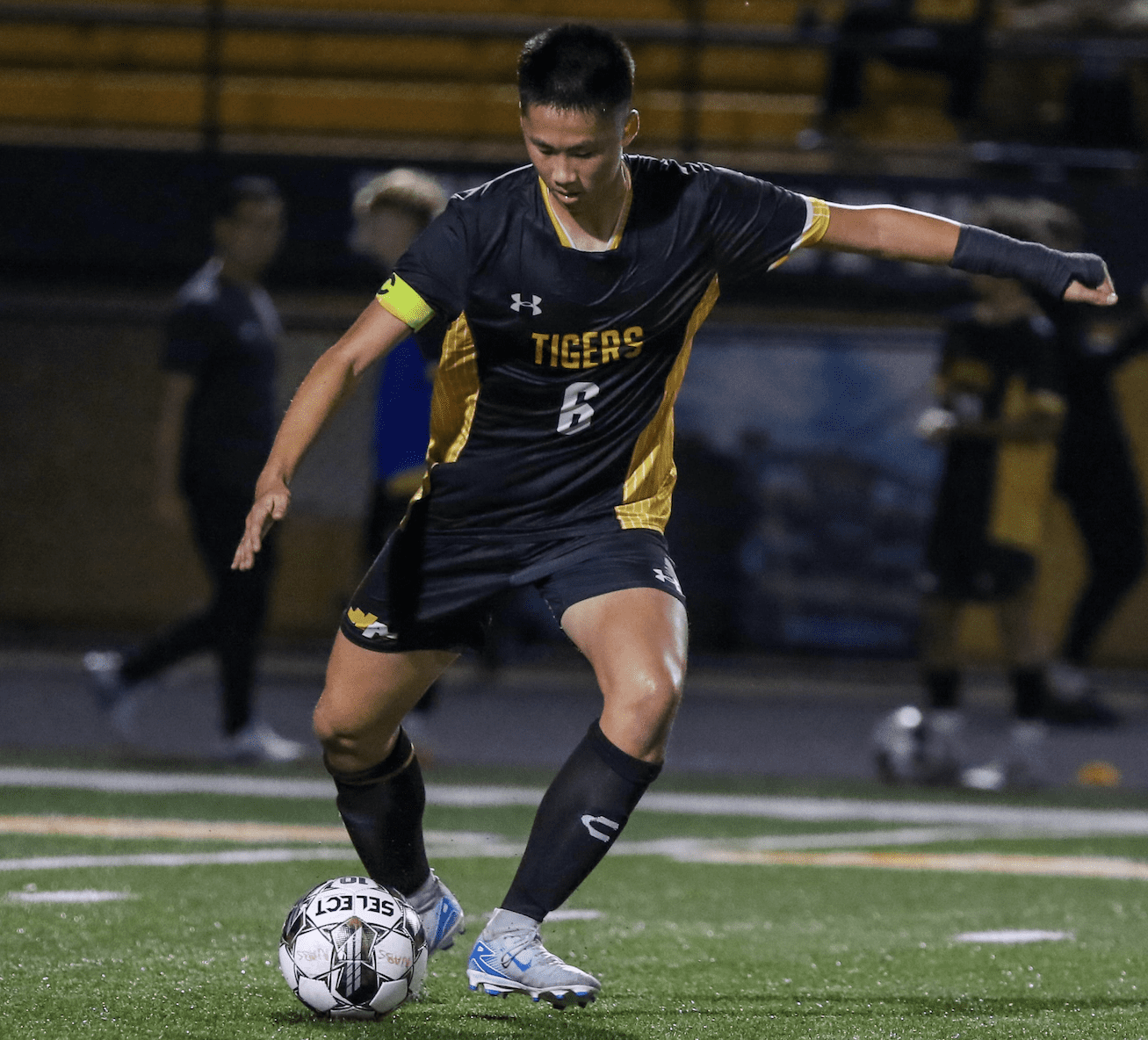Soccer player in black and yellow jersey dribbling a ball on the field during a night match.