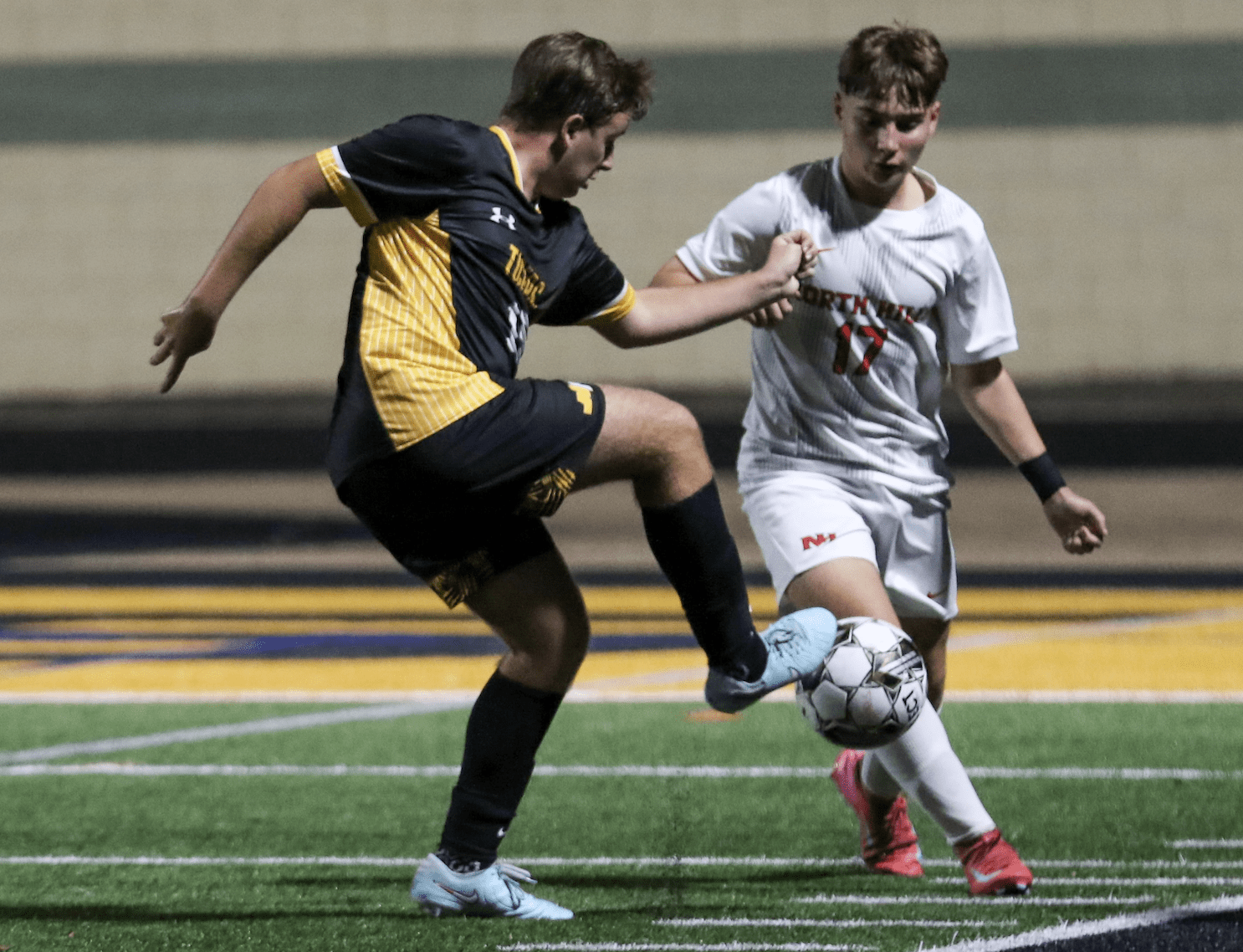 Two soccer players in action during a night match on a green field.