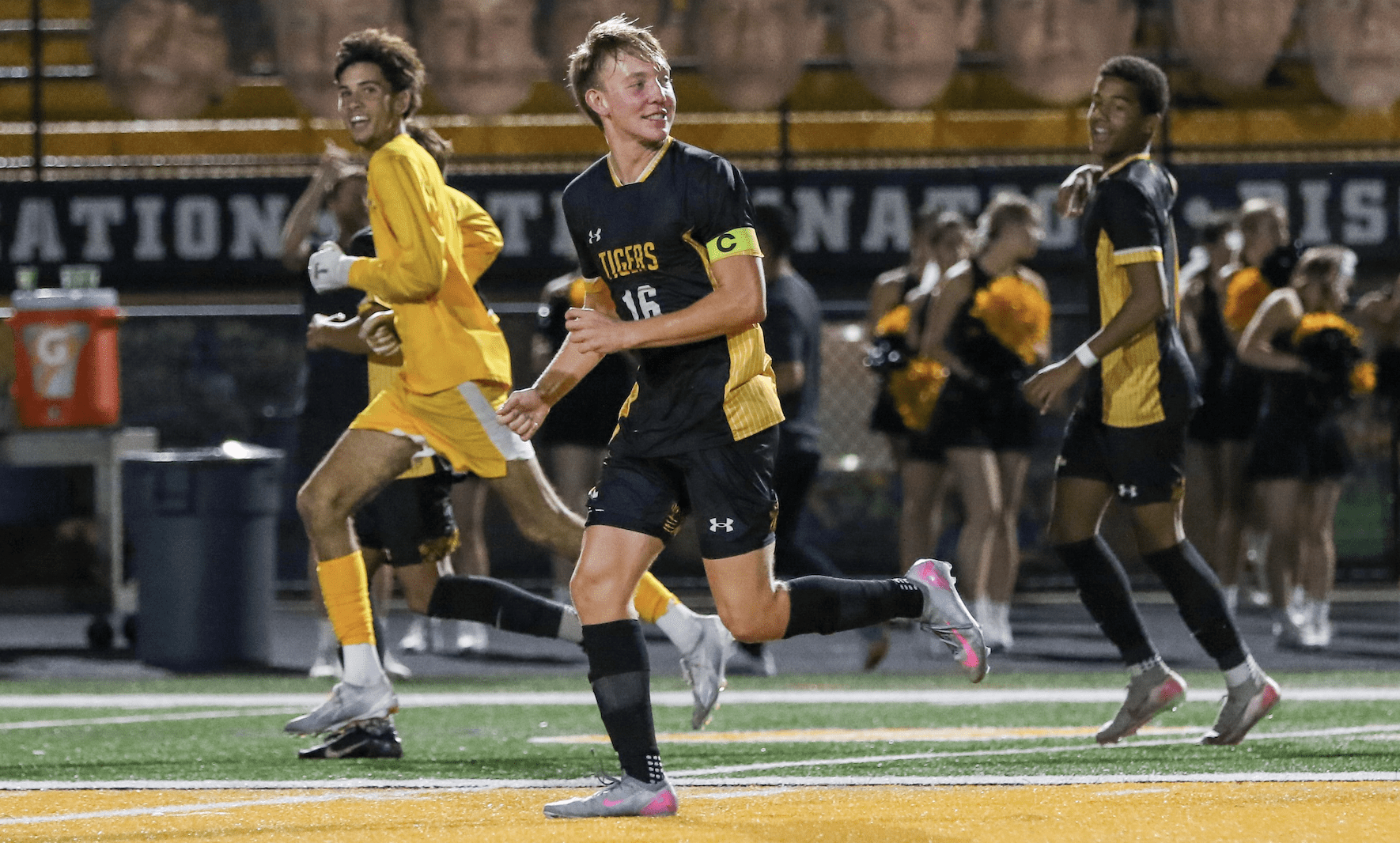 Soccer players in black and yellow uniforms celebrating on the field at night game.