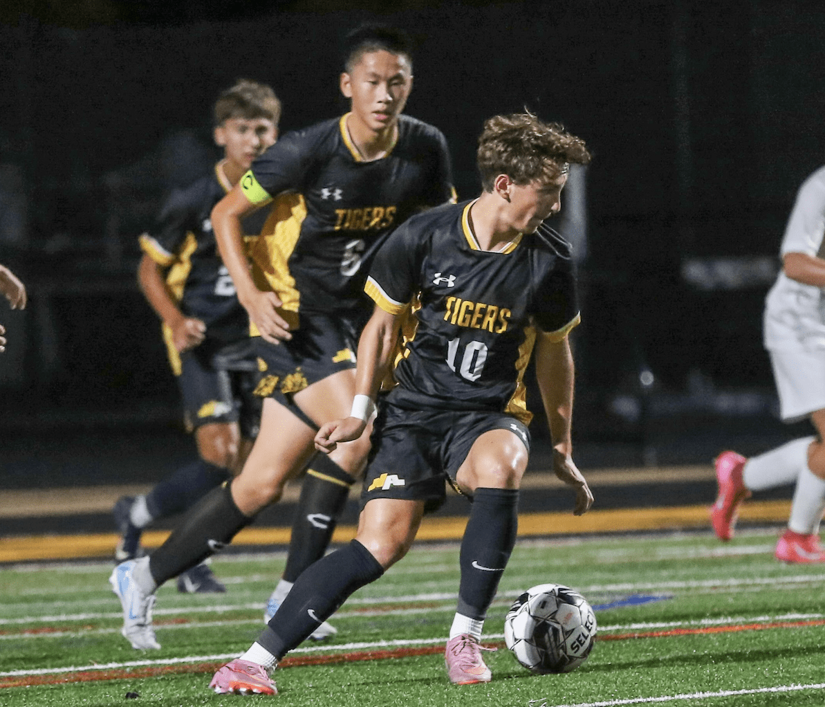 High school soccer game action with players in black and yellow uniforms dribbling on the field.