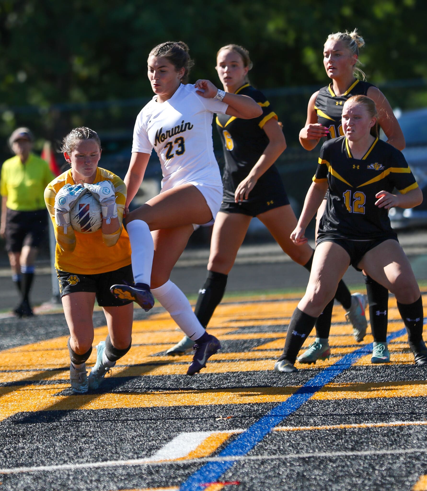 Girls' soccer game action with a goalie catching the ball and players in black and white jerseys in the field.