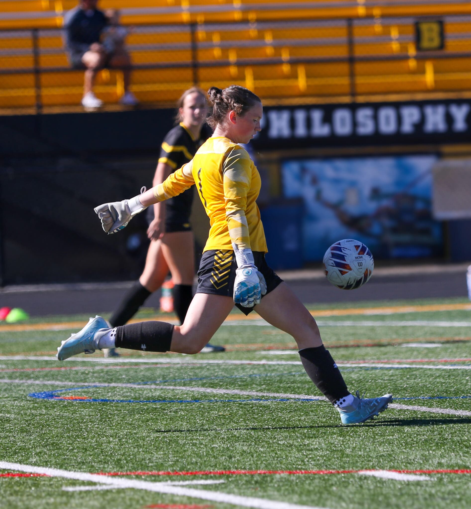 Soccer goalie kicks ball during match, wearing yellow jersey and gloves on grass field.