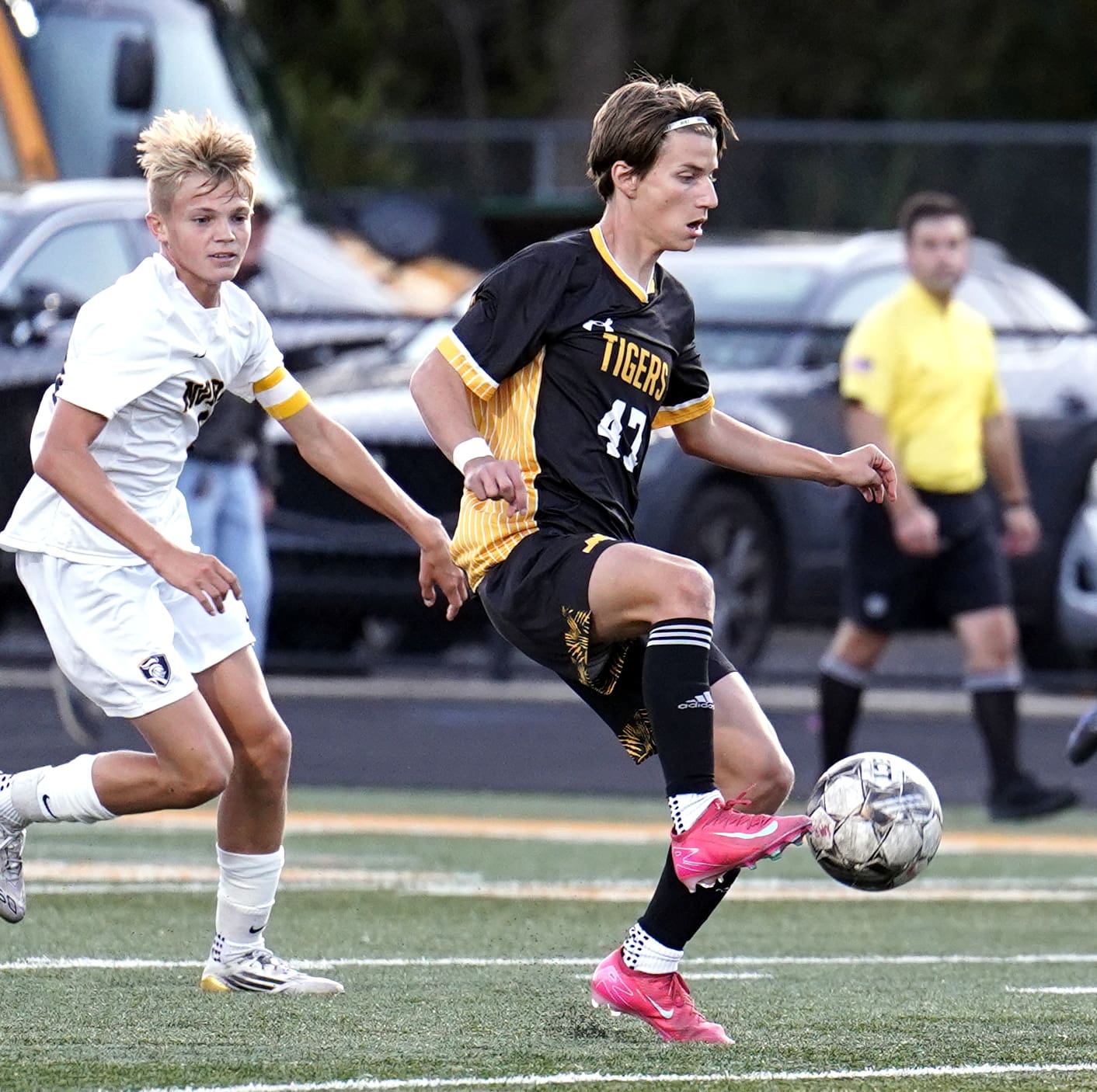 Teen soccer players in action during a match, one in a black uniform controlling the ball.